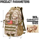 DURABLE & WATERPROOF:Camo Backpack for boys is made of 600D pvc oxford, reinforced and double stitched at all stress points, special coating makes the Tactical Backpack water resistant and scratch proof, strong and durable.This is a great waterproof backpack for school teen. MULTIPURPOSE BACKPACK: Military grade material, lots of storage space,our Backpack can be used as Tactical Boys Backapck, Army Backpack ,Teen Boy Backpack for High School, Camo Bookbag Tactical Backpack for Laptop,Military Camo Backpack or day pack for daily use. COMFORTABLE & BREATHABLE:The Tactical Backpack for men have two thick foamed banded parts on the back part and padded shoulder straps follow the concept of ergonomic design.Shoulder straps disperse the pressure on your shoulders and the soft material makes you feel more comfortable when you put on this Camo Tactical Backpack. SIZE:12in*7in*19in,about 30L,enough to contain your 15.6in laptop,thin clothes,phone,camera,books and other items,as a great survival Camo Backpacks MOLLE BACKPACK FOR BOYS: MOLLE webbing for attaching a variety of accessories like pockets, hooks or small utility pouch.This military molle camo backpack with a USA Flag Patch stick on the front.It's also a wonderful present for teen boys.