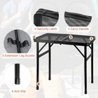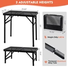 Sturdy Metal Construction: The camping table is made of iron mesh desktop and aluminum alloy frame. Hexagonal thickened aluminium alloy tube table legs have a larger weight bearing area. Holds up to 90 lbs. Height Adjustable: Height can be adjusted to suit specific needs, from a height of 10.6 inches to 22 inches by simply screwing in extension legs that embedded underneath the desktop. Easy to Install and Fold: Our foldable table is easy and quick to set up and fold up without additional tools. The unfolded size is 23.62 inches x 15.75 inches, provides plenty of space. Lightweight and Portable: Folded size is 15.75" x 11.81" x 2.56" and weighing only 4.85 pounds, it is compact and easy to store and transport in a RV. Perfect for use as a grill table while camping, traveling and picnic. Easy to Clean: The top of this folding table features an iron mesh design that resists heat, water and rust. Allows spills and crumbs to pass through for easy cleaning and maintenance.