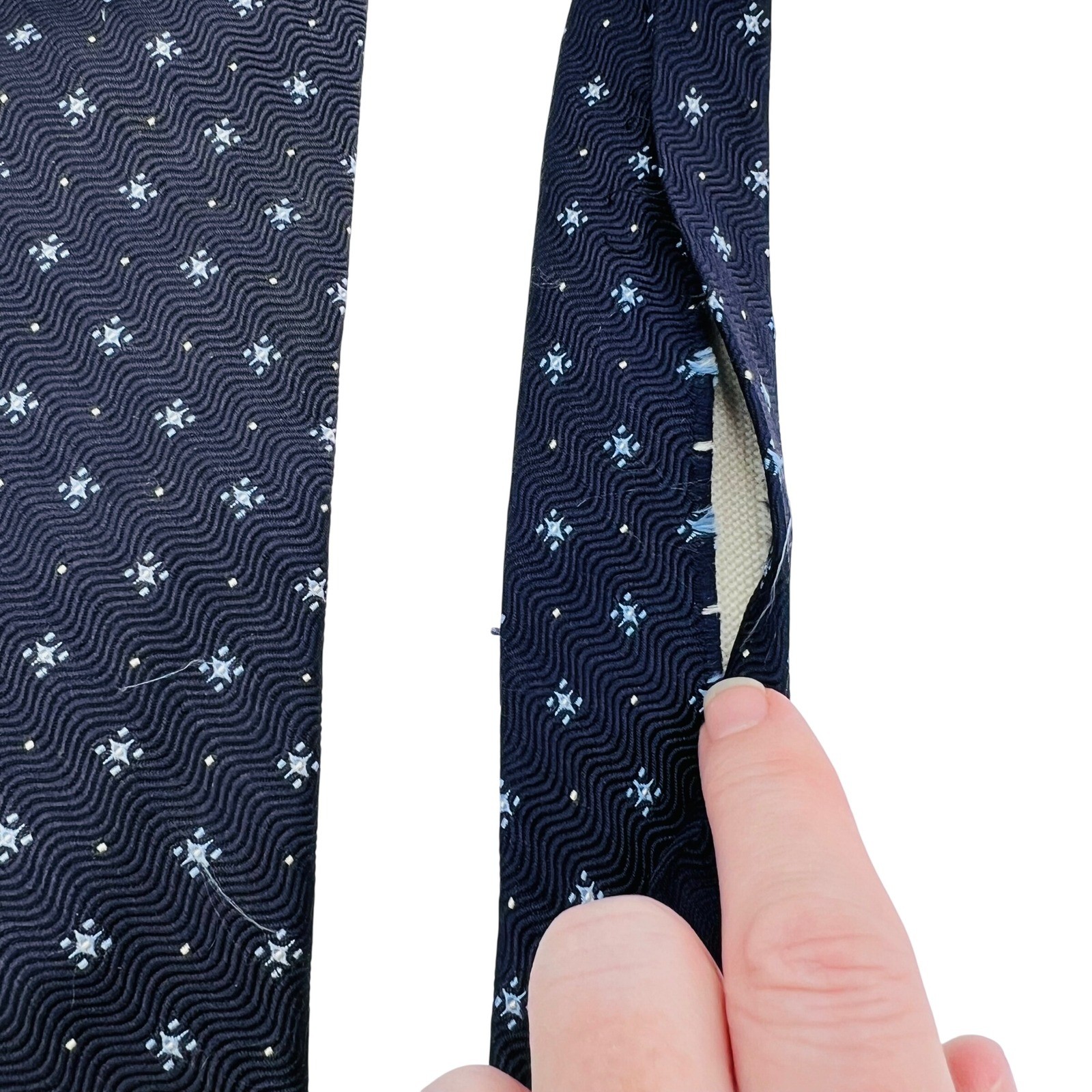 Canali silk necktie handcrafted in Italy features a sophisticated navy blue palette with a textured wavy weave. The design is accented by a repeating geometric star and dot pattern in light blue and white, offering a classic aesthetic for professional or formal wear. This piece showcases the high-quality craftsmanship expected from the brand, though it does require a minor repair to the rear seam. Good pre-owned condition, minor flaw: loose thread on inside which can easily be fixed - sse photos. Priced accordinly! Measurements: • Length: 61 in • Blade Width: 3.75 in Keywords: Luxury, Italian, Silk, Geometric, Corporate, Formal, Wedding, Designer, Classic, Preppy, Sartorial, Business, Professional, Textured, Navy Blue Check out my store for other great finds. See my other listings!
