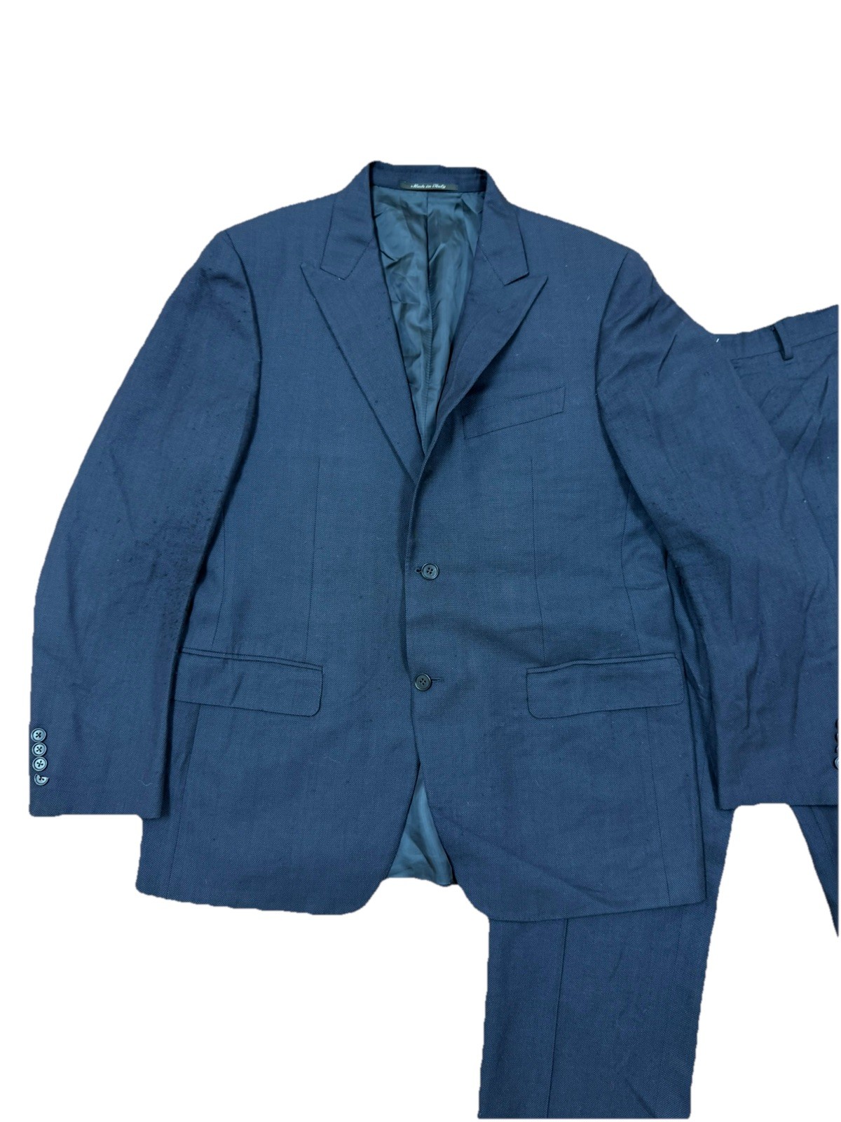 This Canali men's suit in navy is a sophisticated and classic choice for formal occasions. Made in Italy from pure wool, this 2-piece single-breasted suit features a classic fit, a notch lapel, and a four-button sleeve button style. The suit includes inner pockets, a ventless jacket, and a straight leg style. The timeless design, high-quality materials, and exquisite craftsmanship make it a versatile and stylish option for weddings, business meetings, or any formal event. Some wear on pants. Please see photos carefully. No tares overall great condition