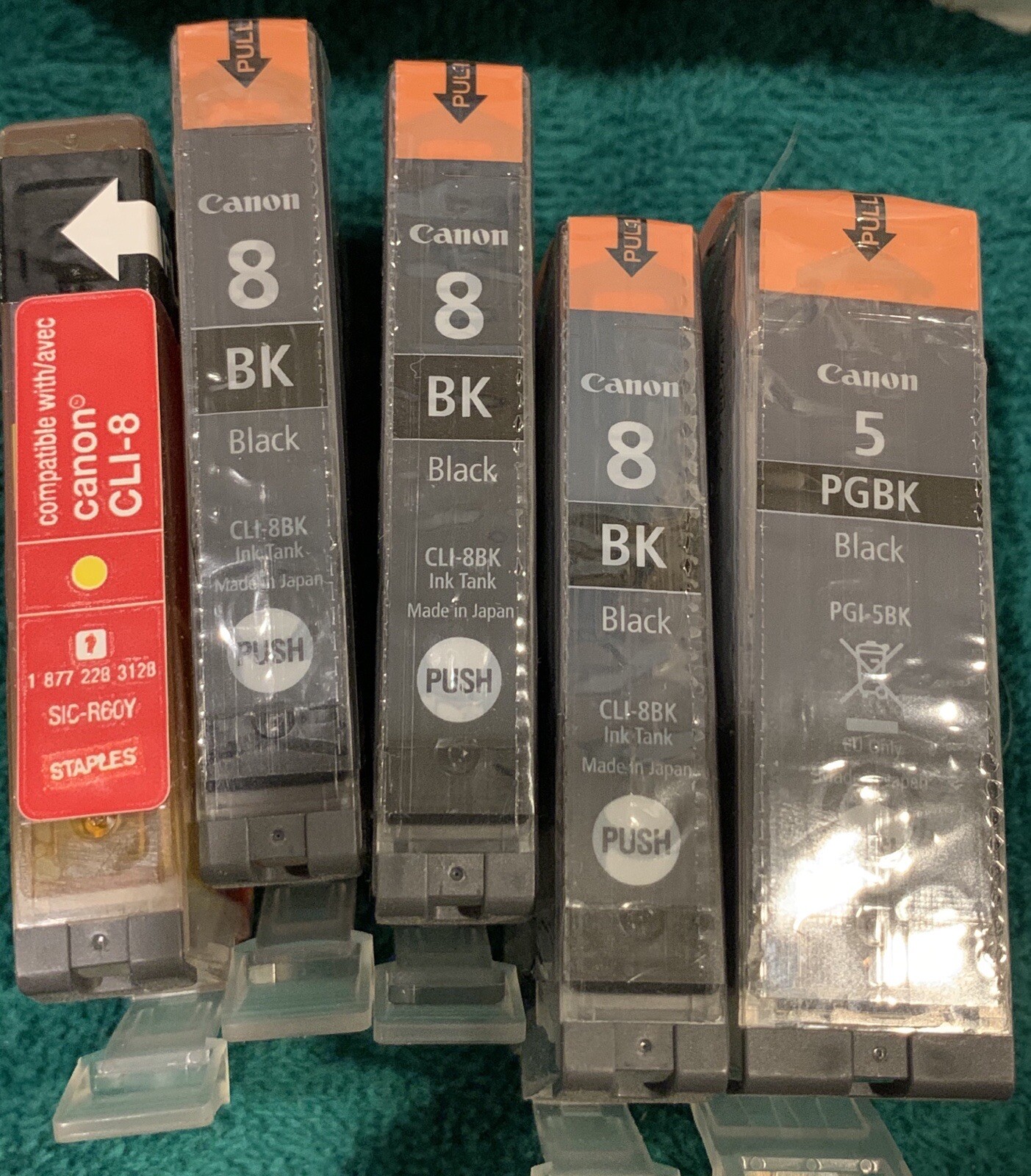 Set of 5 cartridges for Canon Printers Three (3) - CLI-5 Black One (1) - CLI-5 Yellow One (1) - PGI-8 Black See photo for details Original Canon ink tanks deliver long-lasting quality to all your photos and documents. Compatible with: Canon PIXMA iP3300, iP3500, iP4200, iP4300, iP4500, iP5200, iP5200R, iP5300, iP6600D, iP6700D, iX4000, iX5000, Pro9000, MP500, MP510, MP520, MP520 Everyday, MP530, MP600, MP600R, MP610, MP800, MP800R, MP810, MP830, MX850, MP950, MP960, MP970 Designed with FINE (Full-photolithography Inkjet Nozzle Engineering) technology, your prints will realize added sharpness, detail, and quality