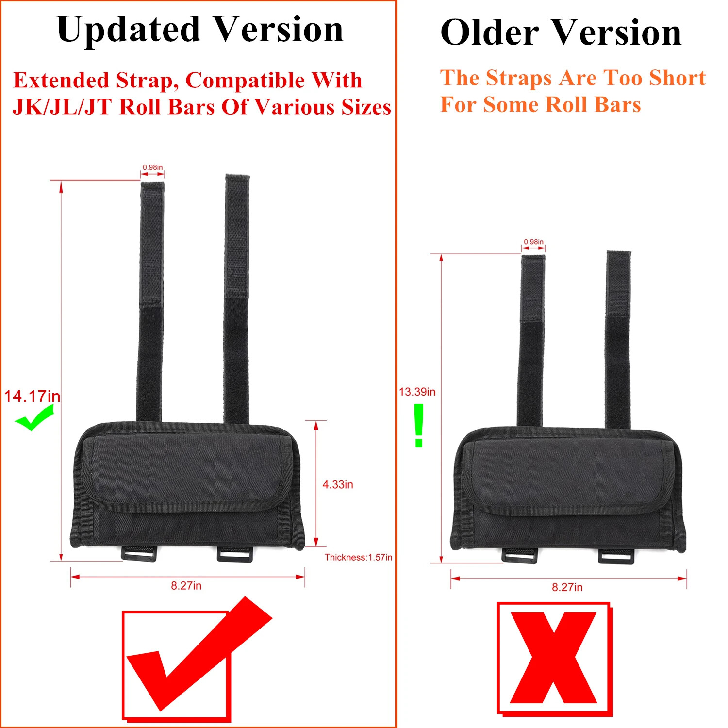 UNIVERSAL FITMENT--- Roll Bar Sunglasses Holder Storage Bag For JK JL TJ CJ YJ JKU JLU Sport X Sahara Unlimited Rubicon 2/4 door & Gladiator JT And Possibly Fits Other Off-road Vehicles That Have Roll Bars And Any Truck With Roll Cage IT IS OUT OF THE WAY--- You Can Put It On The Wrangler Driver's Side Or Passenger Side On The Roll Bar Above The Driver's/Passenger's Window Close To The Visor A Convenient And Out Of The Way Location LONG ENOUGH MOUNTING STRAP--- Enough Velcro On Attachment Straps,This Would Be Perfect On A Bare Tube, Also Quite As Perfect On The Covered/Shrouded/Padded/Luxury Roll Bars.Fit Any Model Wrangler Or Gladiator Roll Bar GREAT COMPATIBILITY--- Compatible With Most Sunglasses, Reading Glasses, Myopia Glasses It Can Also Be Able To Put A Few Items Inside Like Insurance Card Or Other Things Of That Nature LONG SERVICE LIFE--- Roll Bar Sunglasses Holder Storage Bag Made Of 600D Wear-resistant And Waterproof Oxford Cloth Material, Not Easy To Break, Wear-resistant, Not Easy To Fade, And Can Be Used For A Long Time