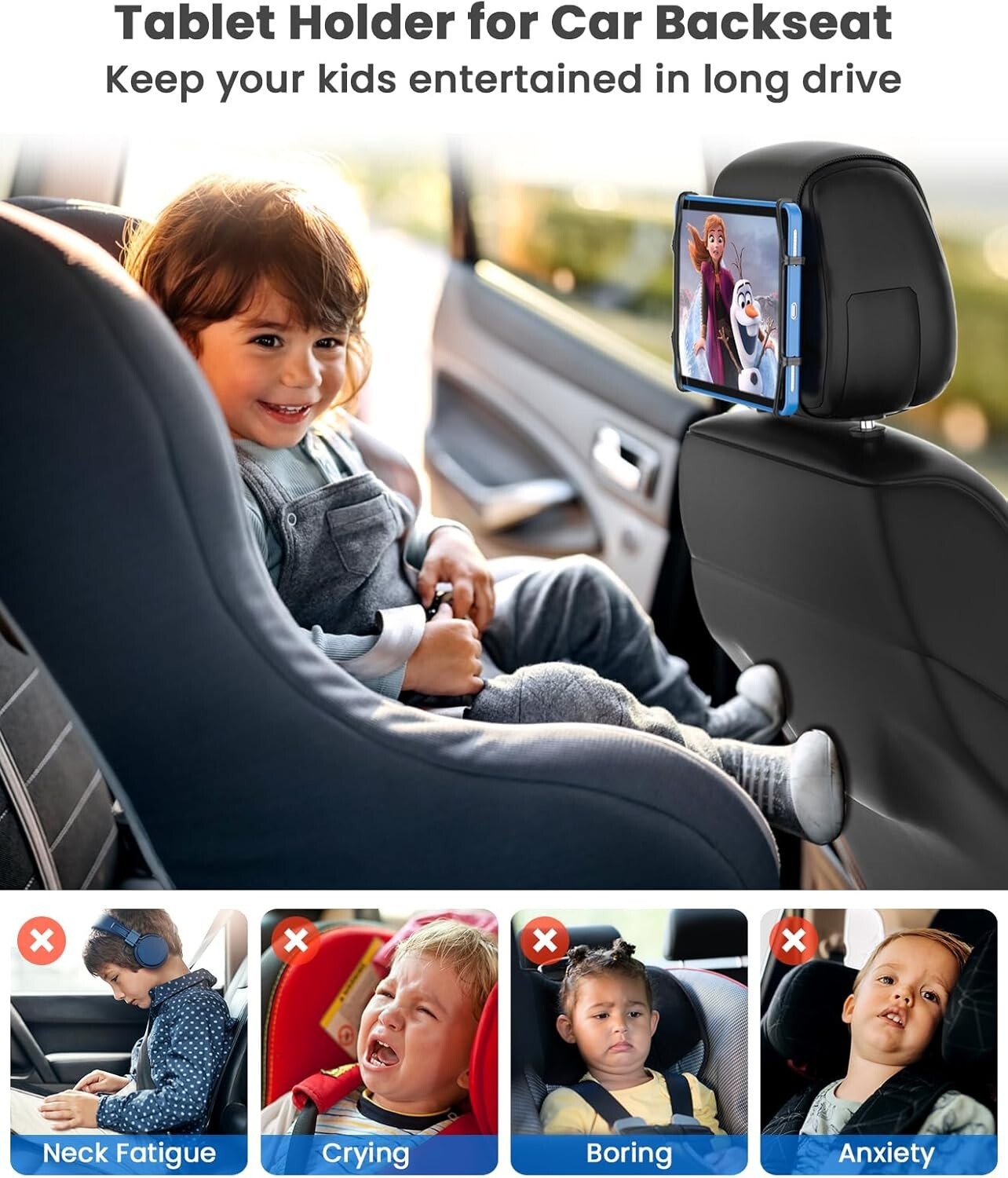 Tablet Holder for Car, Upgraded iPad Holder for Car Back Seat Headrest 1 Pack About this item 【Compatible with All 7-12.9inch Tablets】This universal ipad holder for car boasts a new Upgraded high elastic and sturdy rubber holding net, which can be stretched to 7-12.9” tablets. Adjustable headrest strap supports to install with different size car backseat headrests horizontally or vertically, which is suitable for most cars 【Safe Sturdy Materials and Scientific Design】Our ipad car holder back seat is different from other plastic or metal mount, we use soft rubber holding net and nylon headrest strap. It can easily fix your device on the back seat firmly, protect your car/tablet from being scratched and it can be used for thousand times 【Upgraded V*elcro & No Slip】We've enhanced the v*elcro surface area on the car tablet holder, ensuring a stronger bond with the silicone holding net. Your tablet will stay firmly attached to the car headrest, even during speed bumps or rough roads. Say goodbye to worries about slips or falls—travel with confidence! 【Perfect Companion for Car Travel】This headrest tablet holder can be installed in car backseat and hold your kids tablets tightly. Not only can keep your kids entertained in the whole long boring driving trip but also can avoid neck fatigue and arm injury of holding a tablet for long time. No need to worry about your child will throw a tantrum or cry anymore in road travel so you can focus on driving for a safer journey 【Easy Install and Remove】You can install ipad car mount to your car backseat headrest without any auxiliary tools. Your tablet will be fixed tightly and safely in the car headrest with just four simple steps. The holder also can be torn down quickly by removing the headrest band. Save your time and energy greatly