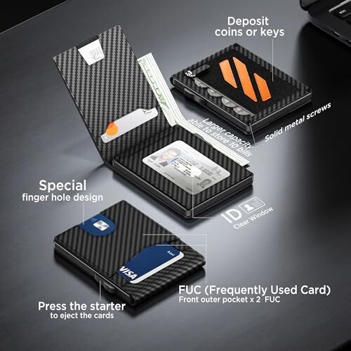 Return Policy Fast Delivery Trusted seller Wallet for Men, Pop-up Case, Cash Slot, RFID Blocking Mens Wallet with ID Window, Minimalist Wallet for Credit Cards,With Coin Pocket (Carbon Fiber) Product Description 【Mens Wallet】 This men's wallet is made of high-quality leather with metal aluminum chambers. combines the characteristics of leather wallets, zipper pockets and credit card sets, Allows you to carry cash and coins and keys at the same time. the new design is convenient and stylish. 【Rfid Wallet for Men】 This pop up mens wallet utilize advanced RFID blocking Built in RFID chip will shield your credit cards debit card, and driving license from unknown scanning device, ensuring your personal information remains private and secure. 【Ample Storage Space】 This minimalist wallet ample storage capacity to hold about 15 cards, as well as cash. Instant card access at the tap of a button by a single hand. while t is an ID window for your driver's licence and more. and the zipper pocket on the back allows you to put in a few coins and small items, so your traveling becomes easier! 【The best present】 The Minimalist wallet is presented in a simple and elegant gift box packaging, It can be a perfect gift to your father, husband, son or boy friend on Christmas Day, Thanks Giving Day, birthday or any other festival. 【Worry-Free After-Sale 】 We provide 24 months of free warranty and efficient customer support service. If you have any queries, please feel free to get in touch with us. We will give you a satisfactory reply within 24 hours. Shipping Returns Payment Shipping Shipping is FREE to all addresses other than APO/PO boxes in the lower 48 states. All our stock ships from US-based warehouses. Shipped via USPS or UPS (depending on location and package weight) Unless stated otherwise, all orders will ship within 24-72 hours of your payment being processed. Check our feedback to see the great reviews of FAST shipping we offer. Returns Seller does not accept returns Payment We currently accept payment via eBay managed payments only. Once payment is cleared, we will dispatch your shipment within 1-3 business days. Please refer to the "Shipping" tab for more information regarding shipping speed to your destination.