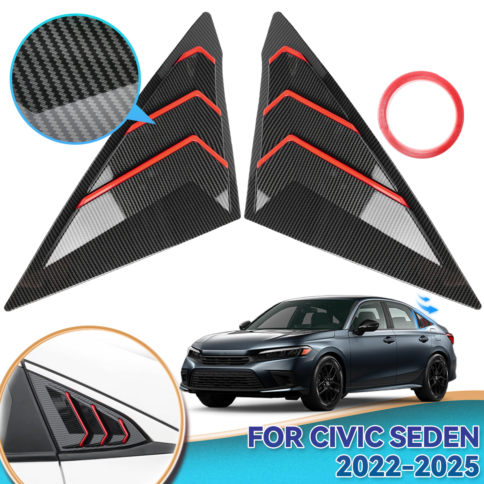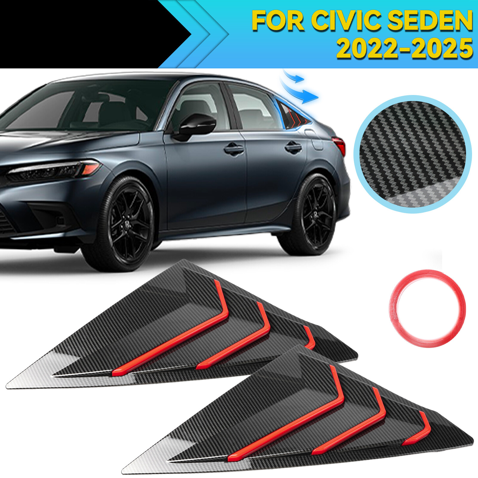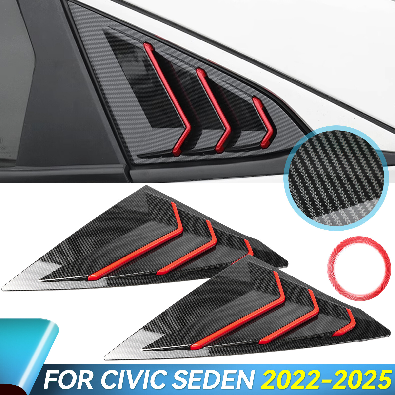 Carbon Fiber Quarter Panel Rear Side Window Louver For 2022-25 Honda Civic Sedan This listing features for two pieces Carbon Fiber Red Window Side Vent Louver Cover Trims, specially design for Honda Civic 2022-2025 Seden This item made by premium quality ABS material with Carbon Fiber Texture. It is a great decoration trim for the Vehicle rear quarter window and will give your vehicle an upgrade and customized. It is more protective for handles from scratches and give your car a luxury and unique look. Fitment Attention!!!this item fit for 11th Civic For 2022-2025 Honda Civic Seden Please make sure your car is the same as the picture we show you before purchase. Features 100% brand new, shown as pictured Color: Carbon Fiber Red Material: Premium Quality ABS plastic with Carbon Fiber Texture Come with double side automotive tape on the back Waterproof and never fade, wear-resisting & scratch-resistant Made in an ISO 9001 facility to ensure good quality Extremely durable and can last a long use time Protect the installed area from scratches Decorate car appearances, make your car particular and luxury Easy installation, directly replace, no any modification needed Surface must be clean and dry prior to adhering Package Included 1Pair Window Louver 1x Double Sided Tape Installation Clean the place where you want to installed it, use rubbing alcohol first. (make sure to remove the dirty,like grease, wax or dust) Remove the high strength double-sided adhesive from the back of the plate. In the case of a relatively low temperature, heat installation location, and plate with a hair dryer on low setting. Put the product in desired location carefully and press down for about 1-2 minutes, The adhesive should be cured after 12-hours. General Policies : Dear customer,if you have any questions,you can contact us,we will provide the best service for you. Shipping policy : The item will be shipped within 24 hours on payment received except the holidays.(except weekends & official holidays). You can log on to eBay to check your logistics tracking number. Please confirm address before purchase, and cannot change address once purchased. If you need to receive the item quickly, please contact us, you can pay the postage to choose other logistics. Payment: Please purchase and pay for the item through the eBay,only acc e pted the paypal payment. Returns: Please contact us first when return, exchange and refund is required. Any direct return of purchased items will not be processed. Item must be returned in new condition, as received with all accompanied accessories and literature, including the factory carton. Shipping, handling is not refundable unless item is returned because of defect. If the product is defective or damage upon arrival,please contact us immediately,we will provide the solve the problem. Returns accepted within 30 days of delivery date and item must be in original new condition. About us: Our goal is complete customer satisfaction. We will be very honored to provide you with quality service. If there is an issue with shipping or the item you purchased please contact us via e B ay message or call us before opening a case or leaving feedback.We will try our best to resolve any kind of issue.