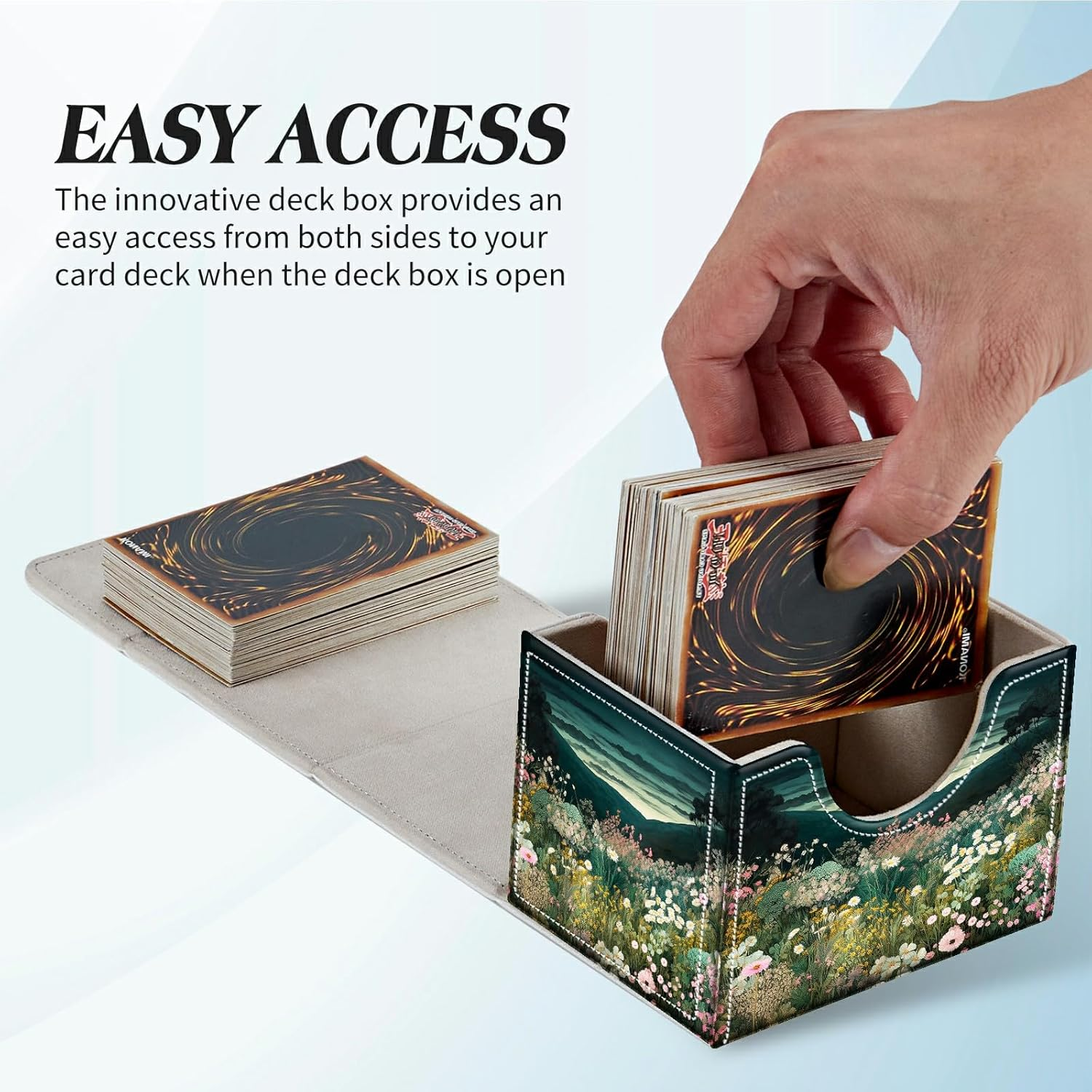 🎀U-shape Design Easy Acess: BFDHGQZC box features a double-sided, wide-mouth U-shaped design; Even if the box is full of cards, you will be able to easily remove them all at once; The just-right design allows you to put and take cards with ease and without hindrance 🎀Premium Materials: for MTG commander deck box case are made of PU leather with scratch-resistant, wear-resistant, non-slip texture, hard front and rear, and also come with magnetic seals and tight stitching to securely store your cards for a long time 🎀Large Capacity: BFDHGQZC for MTG card deck box measures 4x3x3.3 inches and can hold up to 200+ sleeveless cards or 150+ single-sleeved cards or 90+ double-sleeved cards. 🎀Safety Magnetic Closure Cover:Embedded strong magnetic magnet ensures that the box will not accidentally open, and even when moving with full load, the card will not fall off,Whether you are a collector or a gamer, you can enjoy a worry free and safe storage experience,Don't worry about accidentally dropping or damaging the card. 🎀Multi Use: BFDHGGQZC collectible trading card case Suitable for a variety of TCGs, CCGs, LCGs & other collectible cards; Compatible with Magic The Gathering MTG, YuGiOh!,Cardfight!! Vanguard,Duel Masters,Panini football cards and many more. BFDHGQZC team is a dynamic team, we not only offer a range of unique patterns of card boxes, but also the same pattern of card game MATS, to match with the card box to create your own exclusive play territory. Please search our store and discover more products. Different Colors Pattern: There are different patterns for you to choose from, and you can choose a box that you like Three sides open: Equipped with a magnet seal and tightly sewn threads, it is the best way to store and protect your game cards. Capacity: The card holder case has a large capacity and can hold more than 150 sleeved card Safety Lock: Safe Self-locking Lid is one of the features of this commander deck storage box, whenever, when your lid is put down, it can automatically lock the lid. Let your cards stand perfectly in the box, no matter what the situation is, they will not be scattered all over the floor/table. Easy Access: U-shaped slot designed on the two sides of premium PU cardboard so that it is more convenient to access the game card at any time Wide Compatible: Premium Cards Holder Box size fits all trading card games. including for MTG the Lord of the Rings, football cards, baseball cards, transaction cards along with many more.