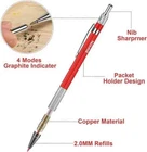 ???4 Pcs Mechanical Carpenter Pencils???there are 4 mechanical carpenter pencils, 2 of them are deep hole carpenter pencils; The deep hole carpenter pencil extends 45 mm in length, suitable for marking through holes or in other tight areas ???40 Pcs Replaceable Refills???The package comes with 40 refills, 2.0 mm refills fit for mechanical carpenter pencils, 2.8 mm refills fit for deep hole carpenter pencils; This set of colorful woodworking pencils can meet your needs for marking a variety of materials; The 40 refills can make the carpenters pencils reused and prolong the service life of the product ???Woodworking Pencils Built in Sharpener???there is a sharpener on the top of the carpenter pencils, which is portable and easy to use; Your pencils will always be pointed and useful; The deep hole woodworking pencil needs to be pressed tightly on the tip, otherwise it will fall off easily ???Wide Range of Applications???the 4 mechanical carpenter pencils are wide applied for construction, automotive, glass window breaker, bowl, drawing on metal, plastic, glass, wood and paper; Suitable for carpenters, builders, businessman, or anyone who need a practical pencil which can mark on variety of surfaces ???Package List???2 pieces mechanical carpenter pencils(red and green) with 2 refills, 2 pieces deep hole carpenter pencils (red and black)with 2 refills, 12 pieces 2.0 mm black refills, 6 pieces 2.0 mm red refills, 6 pieces 2.0 mm green refills (one box has two rows), 6 pieces 2.8 mm yellow and red refills, 6 pieces 2.8 mm black refills