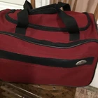 Red canvas carry on bag. Very durable canvas in great condition. Two handles meet in the middle with handle strap. It has an outside zipper compartment on one side and a open ended side that allows strapping on you suitcase. Thank you for looking. Have a blessed day