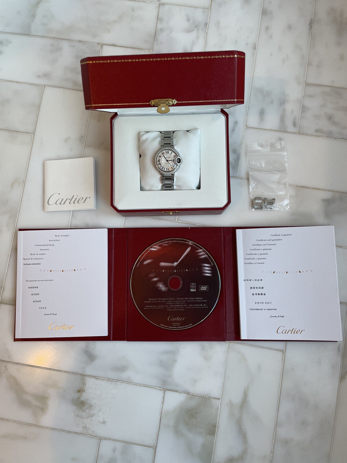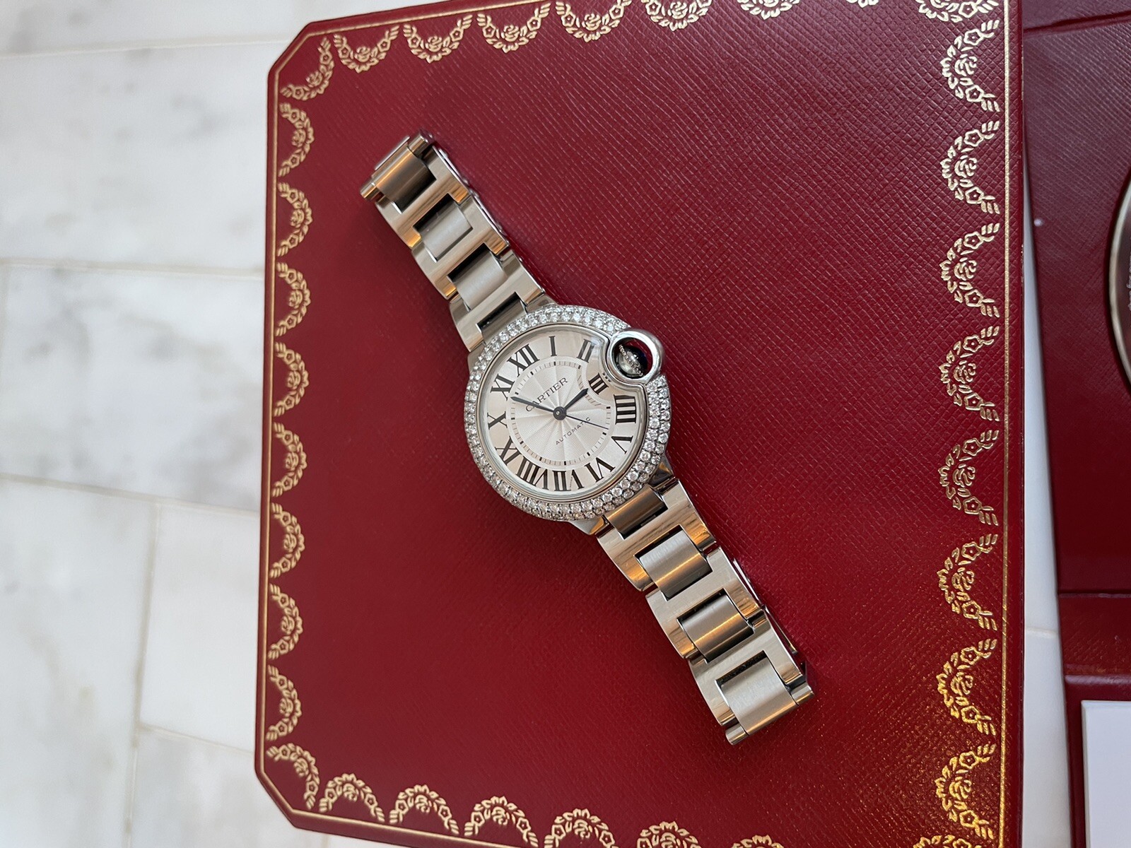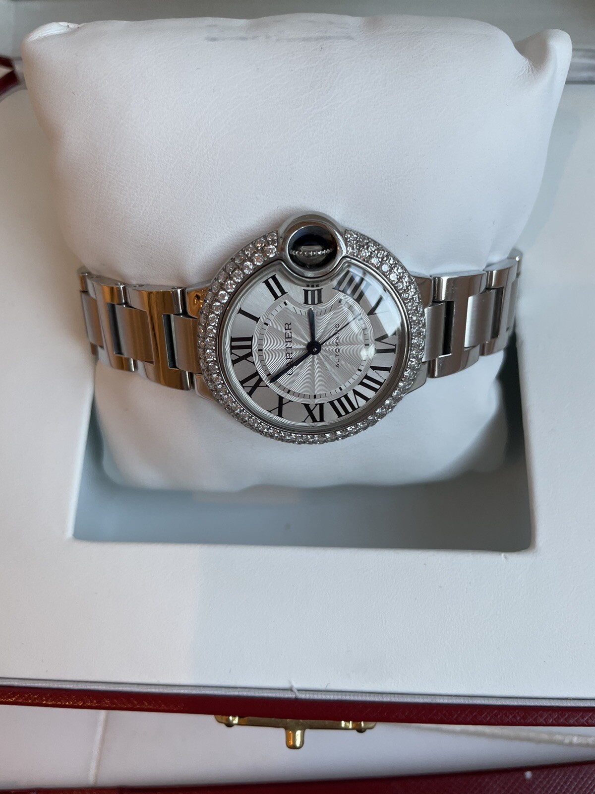 Purchased new through a reputable dealer of Cartier and other high-end timepieces. Lovingly worn for a year and a half and now my wife, a breast cancer survivor, wants to celebrate the end of her treatment journey with a new watch. Selling this to help finance that purchase. The bezel features a double row of professionally-set diamonds. 1.5 tcw, G color, VS clarity diamonds. Includes Cartier box and dated warranty card as pictured. Please contact me with questions or to request additional photos. I am a watch enthusiast and want to be sure I accurately represent its pre-owned condition.
