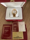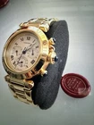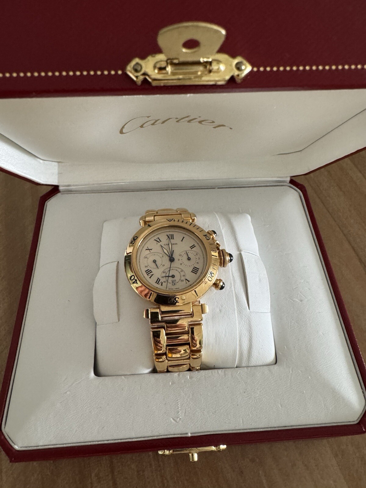 100% GUARANTEED AUTHENTICITY “PASHA DE CARTIER” 38mm Quartz Chronograph Unisex Wristwatch Case and Band made of Solid 18K Yellow Gold with Date Indicator and Sapphire Crystal Made in Switzerland. One Owner Since 1993 With Original Box and Certificate of Purchase as well as Service Records in Excellent Showroom Condition except for minor unnoticeable discoloration on rotator numbers. Please contact PRIOR TO PURCHASE for questions concerns and or additional photos. SALE IS FINAL RETURNS NOT ACCEPTED.