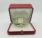Cartier Santos 18K Gold & Stainless Steel Quartz Date Watch & Box • Cartier Santos • Quartz Movement • 18K Yellow Gold Bezel • Synthetic Sapphire Crystal • Date Function • Case Size 29mm • Ivory Dial with Black Roman Numerals • Deployment Buckle • 18K Gold & Stainless Steel Bracelet • Water Resistant Comes With Cartier Box! Guaranteed 100% Authentic or Your Money back! Look at my feedback for OVER 26 years and Buy with total confidence! We do not advise you to wait until the end of the auction to bid on this piece. This item is also for sale now in our retail store until a bid is placed. If you are in the South Florida area you can always come in and look at my merchandise. Be sure to check out my other auctions. Look at my feedback and buy with total confidence!