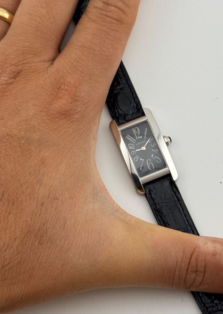 PROPONIAMO; -Marca: CARTIER AMERICAINE LADY -Cassa: ORO BIANCO DA 19X35MM , FONDELLO ORIGINALE SERRATO CON 8 VITI -Movimento :ORIGINALE CARTIER CALIBRO 157 QUARTZ -Vetro:ZAFFIRO -Corona:ORIGINALE CON CABOCHON -Ghiera: ORO BIANCO LISCIA -Tasti: NO -Quadrante:NERO ORIGINALE A NIDO D'APE , NUMERI ARABI CON PASTA LUMINOSA -Lancette: ORIGINALI ORO -Cinturino/Bracciale: PELLE ALLIGATORE 13MM , CHIUSURA DEPLOYANTE ORIGINALE CARTIER IN ORO BIANCO -Scatola e documenti: NOSTRA POCHETTE IN VELLUTO COMPRESA + BOX ORIGINALE (IN FOTO) -Condizioni : OTTIME -Revisionato:SI -Uomo/donna/unisex:DONNA PER QUALSIASI DUBBIO CONTATTATEMI ,RISPONDEREMO IL PRIMA POSSIBILE