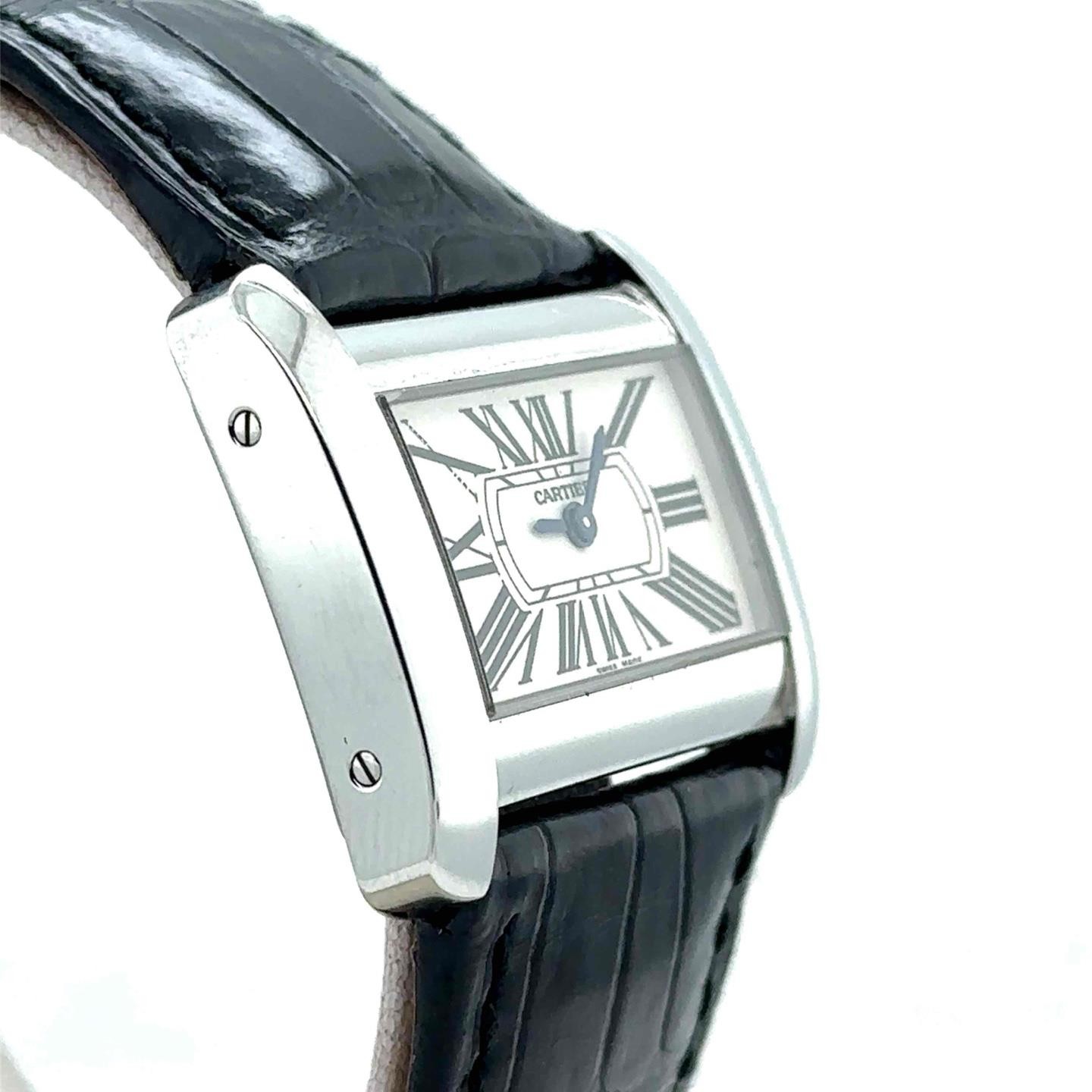 Cartier Tank Divan Quartz 31mm Stainless Steel Men's Watch W63000755 Cartier Tank Divan Quartz 31mm Stainless Steel Men's Watch W63000755 Description YEAR: 2004 Brand Cartier Series Tank Divan Case Dimensions 30 mm Case Thickness 6.7 mm Case Material Stainless Steel Dial Silver Crystal Sapphire Crystal Crown Pull/Push Water Resistance 30 meters Case Back Solid Bezel Fixed Band Material - Color/Finish Black Leather Strap Clasp Buckle Movement QUARTZ MOVEMENT B19609 RIQUEP CE 300+ Listing Templates! Auctiva gets you noticed! The complete eBay Selling Solution. Track Page Views With Auctiva's Counter
