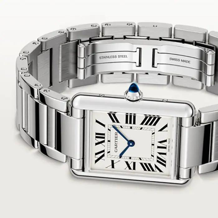 Cartier Tank Must Large Model Quartz Stainless Steel Unisex Watch WSTA0106 Cartier Tank Must Large Model Quartz Stainless Steel Unisex Watch WSTA0106 Description Silver-tone stainless steel case and bracelet. Fixed silver-tone stainless steel bezel. Silver dial with blued-steel sword-shaped hands and Roman numeral hour markers. Minute markers around an inner ring. Dial Type: Analog. Quartz movement. Scratch resistant sapphire crystal. Cabochon crown. Solid case back. Rectangle case shape, case size: 33.7 mm x 25.5 mm, case thickness: 6.6 mm. Hidden fold over clasp. Water resistant at 30 meters / 100 feet. Functions: hour, minute. Additional Info: original box, manual (complete accessories). Tank Must Series. Luxury watch style. Watch label: Swiss Made. Cartier Tank Must Quartz Silver Dial Men's Watch WSTA0106. Case Case Size 33.7 mm x 25.5 mm Case Thickness 6.6 mm Case Material Stainless Steel Case Shape Rectangle Case Back Solid Band Band Material Stainless Steel Band Type Bracelet Band Color Silver-tone Clasp Hidden Fold Over Dial Dial Color Silver Type Analog Crystal Scratch Resistant Sapphire Hands Blued-steel Sword-shaped Dial Markers Roman Numeral Second Markers Minute Markers around an inner ring Bezel Fixed Bezel Color Silver-tone Bezel Material Stainless Steel Crown Cabochon Information Brand Cartier Collection Name Tank Must Gender Mens Model WSTA0106 Watch Label Swiss Made Movement Quartz Features Water Resistance 30 meters / 100 feet Functions Hour, Minute Watch Features Stainless Steel, Analog B3252323 UYWPTP EY $3,850.00 Create your brand with Auctiva's Customizable Templates. Attention Sellers - Get Templates Image Hosting, Scheduling at Auctiva.com. Track Page Views With Auctiva's Counter