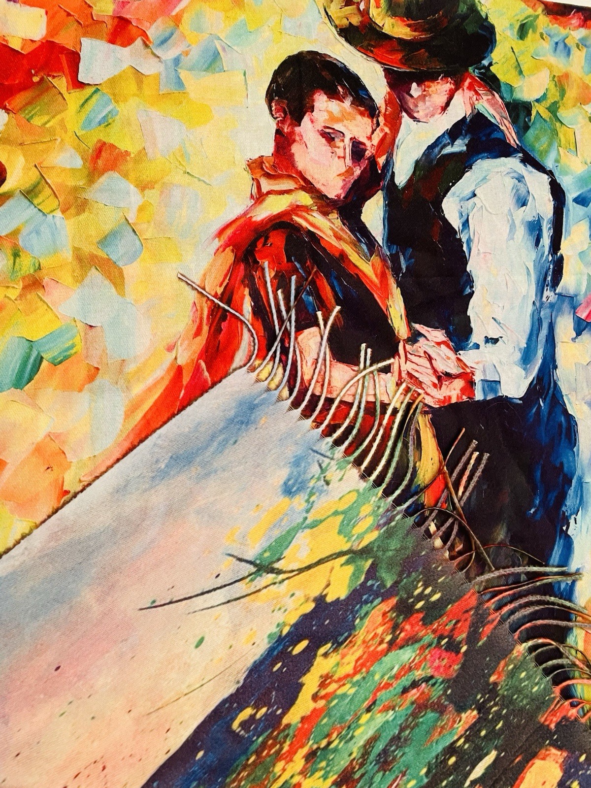 The scarf is reversible. On one side is the reproduction of Impressionist Leonid Afremov famous oil Painting ''Tango'' & and other- oil painting of Summer Bloom Landscape Images. Unique, luxurious, high-quality, soft, warm, durable, elegant and versatile. Size: 72''x 28'' and 80'' x 28'' with fringe. Cashmere and viscosa. Was purchased in Europe. New with tag. From clean, smoke-free environment. Please check my collection for more impressionist artist design scarves.