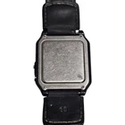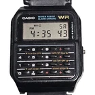 The Casio Calculator Watch is a vintage timepiece from the late 80s or 90s, featuring a unique blend of functionality and style. With a black bezel and a gray dial displaying digital information through Arabic numerals, this quartz watch offers a variety of features including a calculator, alarm, and chronograph. The 35mm rectangular case is made of black resin, complemented by a black canvas band for a versatile look suitable for both formal and casual occasions. This unisex Casio Vintage model is water-resistant and does not come with papers or original packaging. Alarm doesn't make sound.