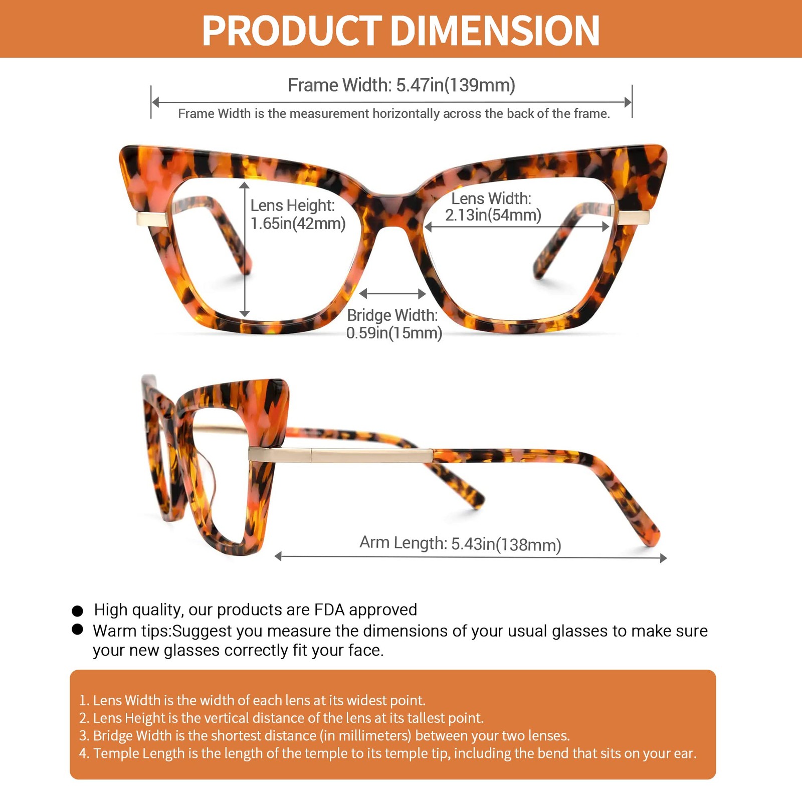 Product Specification: Size:Large Rim:Full rim Materials:Acetate Shape:Cat eye Frame Weight:25.5g RX Range:-20.00~+12.00 PD Range:54~78 Progressive:YES Spring Hinge:NO Product instruction: (1) Why do we need to filter blue light? ▶ Blue light from our computers, phones, tablets, and other electronic products causes our eyes to not only work harder but puts them at risk of aging faster. ▶ By wearing blue light-blocking glasses, you can limit the amount of blue light that enters your eyes and make your screen time more pleasant. Reduce eye strain, eye fatigue, and sensitivity to light during computer term or any other digital time. Protect Your Eyes from macular degeneration and early vision loss, and concentrate more on working and learning. ▶ Voogueme glasses are specially designed to filter out harmful blue light. ▶ Reduce the symptoms of digital eyestrain Eyestrain, Headaches, sore or tired eyes and stiff necks are all symptoms of digital eyestrain. blue light blocking glasses make screen time more comfortable and help eliminate symptoms of digital eyestrain. ❤ Unique cat eye frame combines stylish color match design, stylish and beautiful ❤Made from high-quality acetate, good luster, wear comfortably, these stylish eyeglasses are professional enough to wear in the workroom but are also attractive enough to wear at the party ❤ With the amount of everyday chic just right, unique yet personality, suit for any occasion ❤Glasses use blue light blocking lenses that filter Blue Light and UV, protect your eyes and reduce eye fatigue, dryness and headache during use computer, cell phone or other electronic product, enjoy a better sleep ❤ Dimension -- Lens Width: 2.17" (55mm) , Lens Height: 1.69" (43mm) , Bridge Width:0.659" (15mm) , Frame Width:5.47" (139mm) , Arm Length: 5.51" (140mm)