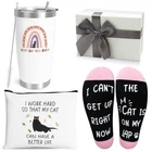 Return Policy Fast Delivery Trusted seller Cat Mom Gifts for Women,20 OZ Wine Tumbler Gifts for Cat Lovers,Crazy Cat Lady Gifts with Cosmetic Bag,Funny Cat Themed Things with Socks Birthday Gifts for Women,Friend,Cat Stuff Product Description Delicate Design Gift Box: 's Gift Box comes with 1 piece wine tumblers with special proverbs -"Best Cat Mom Ever",1 pair of socks with humorous words - "I CAN'T GET UP RIGHT NOW,THE CAT IS ON MY LAP“,1 piece makeup bag with cat design and the text - "I WORK HARD,SO THAT MY CAT CAN HAVE A BETTER LIFE" and a greeting card which you can write down what you want to express.This gift box is perfect for cat lovers High Quality Wine Tumblers with Lid: Our wine tumblers is made of stainless steel, resistant to stains and unbreakable, easy to clean.The double insulated design can keep your drinks hot for 3+ hours and cold for 9+ hours. Even filled with ice or boiling water, the bottle will never sweat or get hot to the touch!Comes with a BPA free clear lid, stainless steel straw, cleaning brush Multifunctional bag: 9 * 7 inch polyester and cotton bag,effective dustproof and anti-scratch, lightweight and portable design, its simple style and delightful colors, suitable for cat lovers work, travel, outdoor and daily use Funny & Breathable Socks: Novelty and breathable socks is very soft and comfortable,fits most people and machine washable and won't shrink Gifts For Any Occasions:Whether it's Mother's Day,Teacher's Day,retirement,birthday,anniversary,Valentine's Day,Thanksgiving,Christmas or any other memorable day, this unique gift box will definitely be loved by cat lovers Shipping Returns Payment Shipping Shipping is FREE to all addresses other than APO/PO boxes in the lower 48 states. All our stock ships from US-based warehouses. Shipped via USPS or UPS (depending on location and package weight) Unless stated otherwise, all orders will ship within 24-72 hours of your payment being processed. Check our feedback to see the great reviews of FAST shipping we offer. Returns Seller does not accept returns Payment We currently accept payment via eBay managed payments only. Once payment is cleared, we will dispatch your shipment within 1-3 business days. Please refer to the "Shipping" tab for more information regarding shipping speed to your destination.