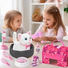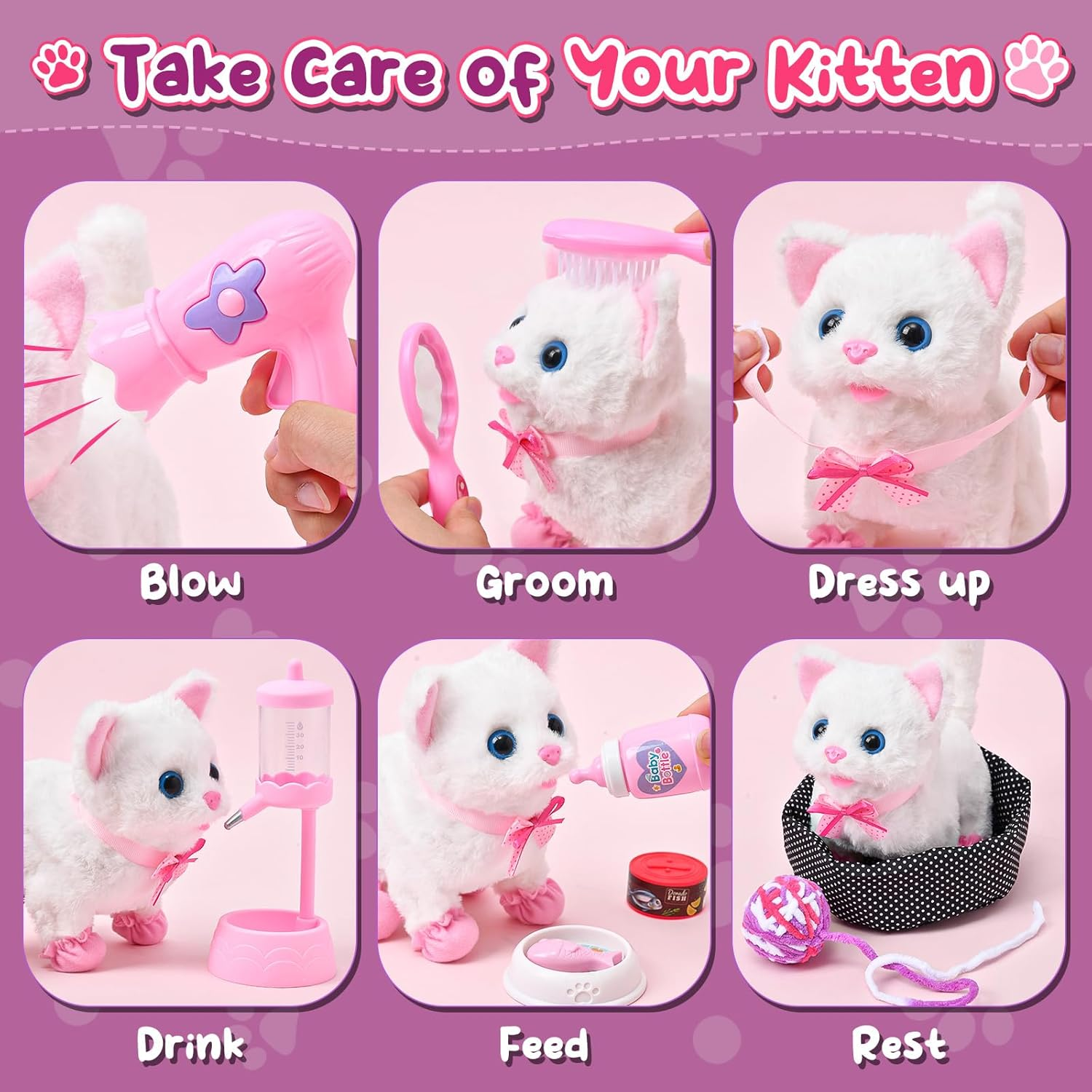 CUTE WHITE CAT COMPANION : Get ready to meet your kids' new furry friend - adorable white cat! With our interactive toy cat, kids' pretend play won't be like a monologue anymore. The white kitten toy comes with batteries installed, enabling it to perform lifelike actions like walking, meowing, and wagging its tail, providing a realistic pet experience. Your kids can indulge in the joys of pet ownership, simulating the daily routine of caring for their beloved feline friend PET CARE & BEAUTY PLAYSET : Our electronic cat toy set features a white cat (batteries are not included), a water dispenser, a cat bowl with fish, cat food, and a baby bottle for feeding. Additionally, a cat yarn ball and a cat bed add to the play experience. Kids will love using the included hair dryer, brush, and mirror to groom their cat, ensuring it always looks its best. The cat carrier bag adds to the realism, while the cat collar and shoes provide for stylish outings GIRLS TOYS WITH PORTABLE CARRIER : Our cat carrier bag boasts a side zipper for easy access, a transparent window for visibility, breathable holes for ventilation, and a handle for taking the set everywhere. All accessories can be stored inside the cat bag, ensuring everything is organized and accessible. Toy cat will be taken care of and shown off by the girls, who pop it into the carrier bag and take it to grandma' s house ADORABLE GIFTS : Designed for kids aged 3 4 5 6 7 8, our kids toys with a cute gift box and toy cat is a nice gift choice. Nice childhood memories as 3 year old girl gifts, toddler girl toys, juguetes para niñas, 4 year old girl Christmas gift ideas, girl toys age 3-4 years old, 5 year old girl birthday gift ideas, toys for girls 4-6, girls toys 6-8. We are committed to ensuring you and your girl have a positive experience CUSTOMER SERVICE : While taking care of the cat stuffed animals, kids learn about empathy and responsibility. Also help develop imagination and social skills. Smooth surface design eliminates any worry about rough edges. With the cat by their side, kids won't feel lonely or bored, even without parents around. We value kids' smile, if there is any issue or concern, we will solve it in time Product description Electronic Toy Cat Set Our interactivecat toy set includes everything your child needs to pamper their new toy pet. Interactive White Cat Toy for Kids Ready to introduce your kids to a fluffy new friend? Get ready to bring this white cat to life with batteries (not included). It can walk, meow, and wag its tail, just like a real cat, making pet ownership a joyous experience for kids. Cat Fun - A Day in the Life of Kitten Care Kids wake up their cat, using baby bottle and cat food for feeding. Girls transform into stylists, using the hair dryer, brush, and mirror to give their cat a sleek and shiny makeover. As the day winds down, kids gently place their cat into cat bed, ready for a night of recharge. Cat Yarn Ball Cat balls with bell inside to attract the kids' and cats’ attention when they are playing. Cat Water Dispenser Accessories full of details. Water dispenser can be lifted and lowered design. Cat Carrier Bag Everything fits inside, so it's easy to keep everything tidy and ready for action. A Wealth of Accessories Interactive Electric White Cat Set includes Feeding Kit - Cat Bed, Cat Carrier Bag, Water Dispenser, Baby Bottle, Cat Food, Cat Bowl with Fish, Cat Yarn Ball Beauty Kit - Cat Collar, Cat Shoes, Mirror, Brush, Hair Dryer. Girls will love taking care of their new cat, and can even show it off to grandma by popping it into the carrier bag and heading out for a visit! Learning & Fun: Empathy, Responsibility, & Skills Our interactive toy cat is great playmate for kids' imaginative adventures. While taking care of the cat stuffed animals, kids learn about empathy and responsibility. Also help develop imagination and social skills. Gift for Girls Designed for kids aged 3 4 5 6 7 8, our kids toys with a cute gift box and toy cat is a nice gift choice. Nice childhood memories as 3 year old girl gifts, toddler girl toys, juguetes para niñas, 4 year old girl Christmas gift ideas, girl toys age 3-4 years old, 5 year old girl birthday gift ideas, toys for girls 4-6, girls toys 6-8.