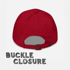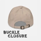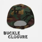 • 100% cotton twill • Green Camo color is 65% polyester • Unstructured • Embroidered Design • 3 ⅛” Soft crown • Adjustable strap with antique buckle
