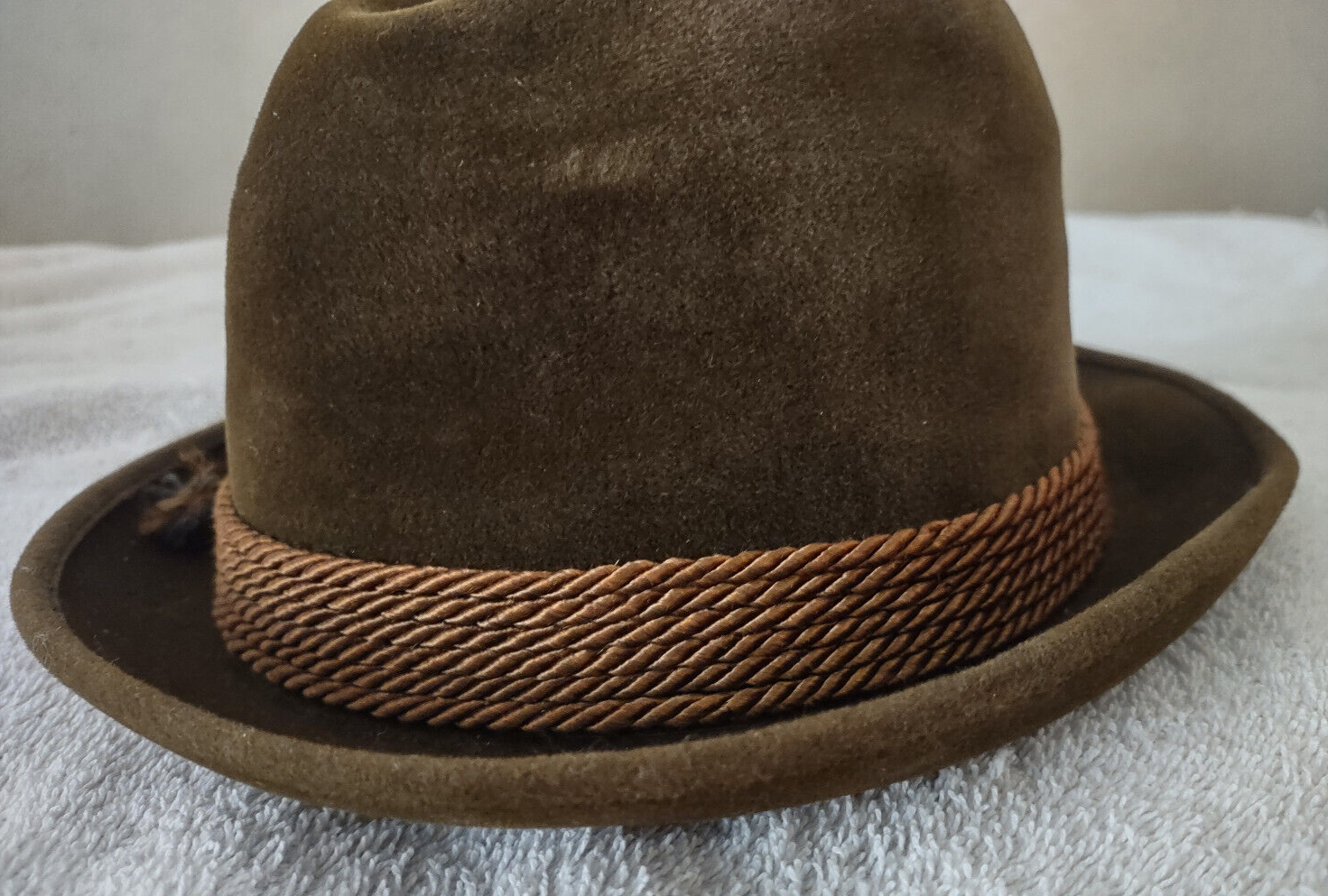 This Cavanagh fedora hat comes in the color brown and the size 7 1/8. The hat is in good condition and looks to have seen little use, as there is no noticeable sign of age aside from some wear/marks on the inner lining. Check photos for confirmation.