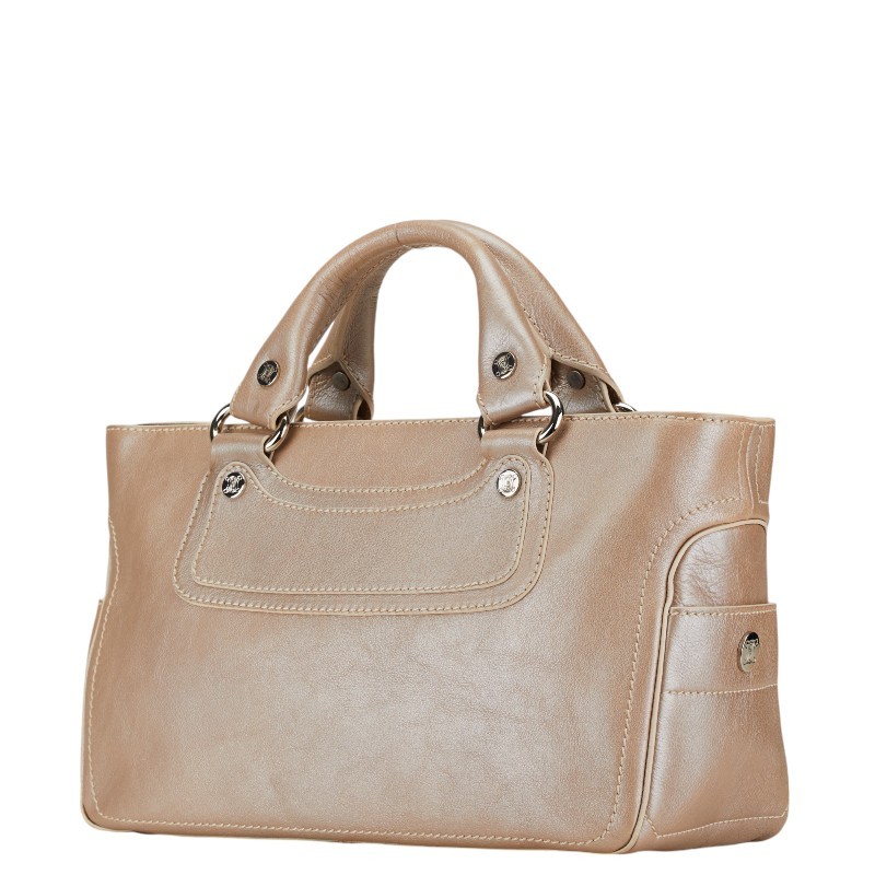 Celine Boogie Bag Women’s Beige Champagne Leather 14" x 7.9" x 5.3" Used Key Features Celine Boogie Bag in beige champagne leather, featuring a spacious open design with a size of approximately 14.2 inches (36cm) W x 7.9 inches (20cm) H x 5.3 inches (13.5cm) D. Handles are about 3.1 inches (8cm) high. Includes a charm, with exterior zip and snap pockets, and interior open and zippered compartments. Condition AB: minor scuffs on sides, bottom corners, slight dirt on handles, and hardware. A stylish, versatile handbag suitable for daily use. Item Specifics: - Brand: Celine - Model: Boogie Bag - Color: Beige Champagne - Material: Leather - Size: W approx 14.2 inches, H approx 7.9 inches, D approx 5.3 inches - Handle/Strap Height: approx 3.1 inches - Closure: Open - Exterior Features: Zip pocket Specifications Brand CELINE Country Japan Product Description CELINE Boogie Bag Handbag Beige Champagne Leather Women's Description Item Condition: Used