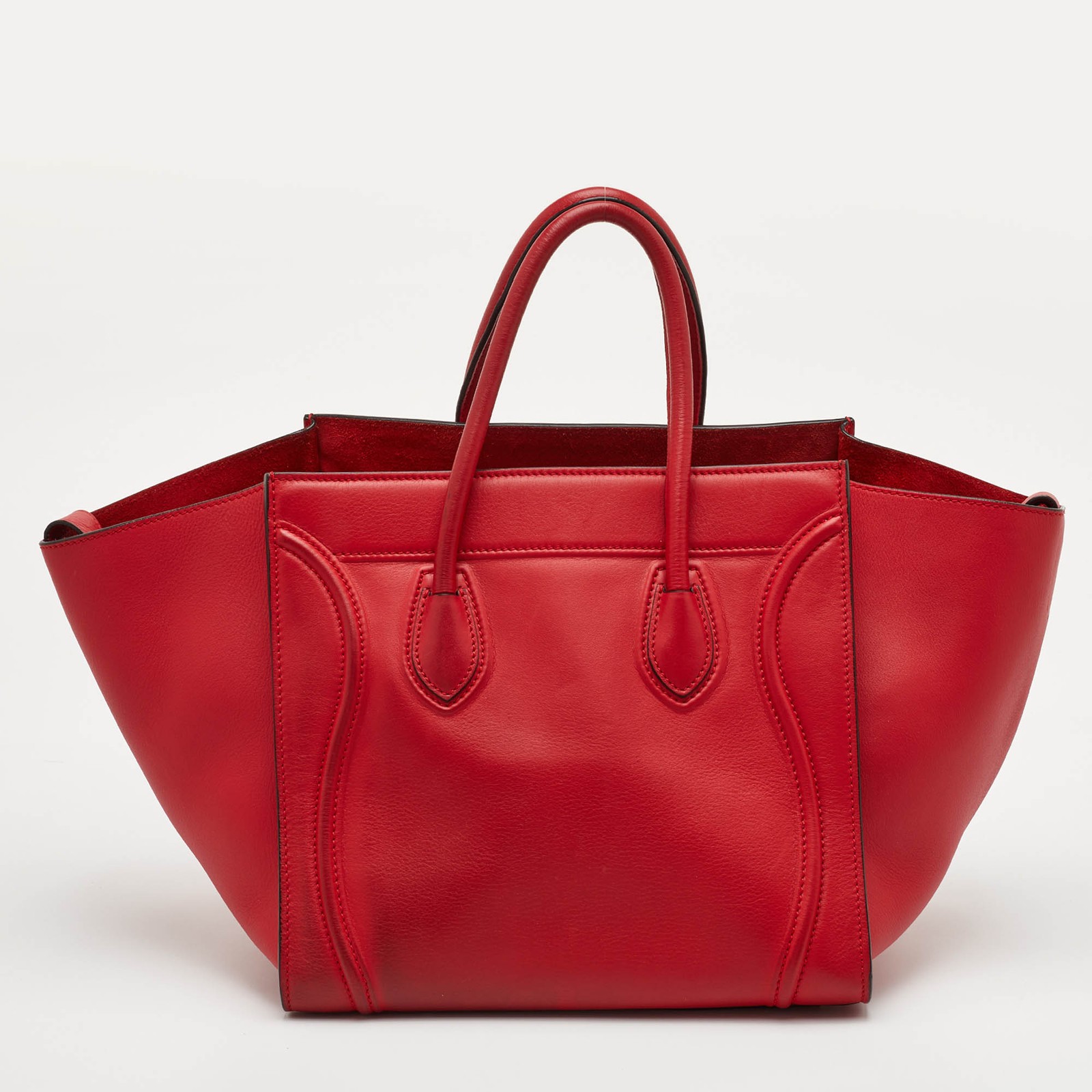 Our eBay Store About Us Contact Us Add to Favorite Sellers Celine Red Leather Medium Phantom Luggage Tote Celine’s Medium Phantom Luggage Tote in red leather is a statement piece with the brand’s most recognizable silhouette. It features the signature winged sides, curved stitched paneling, and the front zip pocket detail that gives the Luggage its iconic look. Finished with double top handles and a spacious open-top design, this bag stands out for its structured shape and bold color while staying true to Celine’s classic design codes. Product Details Brand Celine Includes Original Dustbag Certified by The Luxury Closet This item has gone through a detailed authentication process overseen by our experts. We offer a lifetime guarantee of authenticity on all our items. How We Check The in-house team of experts at The Luxury Closet is highly trained to verify the authenticity and the condition of the luxury products. They ensure that only 100% authentic items are put on sale.The evaluation process is unique with its own mix of assessment criteria and differs according to the category. Each item is evaluated based on the following combination of hallmarks, hardware, stitching, symmetry, material, craftsmanship, stamping, codes, hologram stickers, and packaging. Our authenticators also check if the items have been modified or amended (e.g., aftermarket diamonds, replaced batteries, repaired bags, etc.) Please note that this handbag may have a perfume scent, as it was stored and packaged in Dubai where such fragrances are commonly used. International Buyers Import duties, taxes and charges are not included in the item price. These charges are the buyers responsibility. Please check with your country’s customs office to determine what these additional cost will be prior to buying.