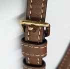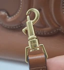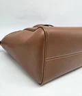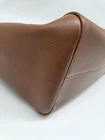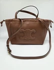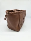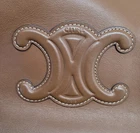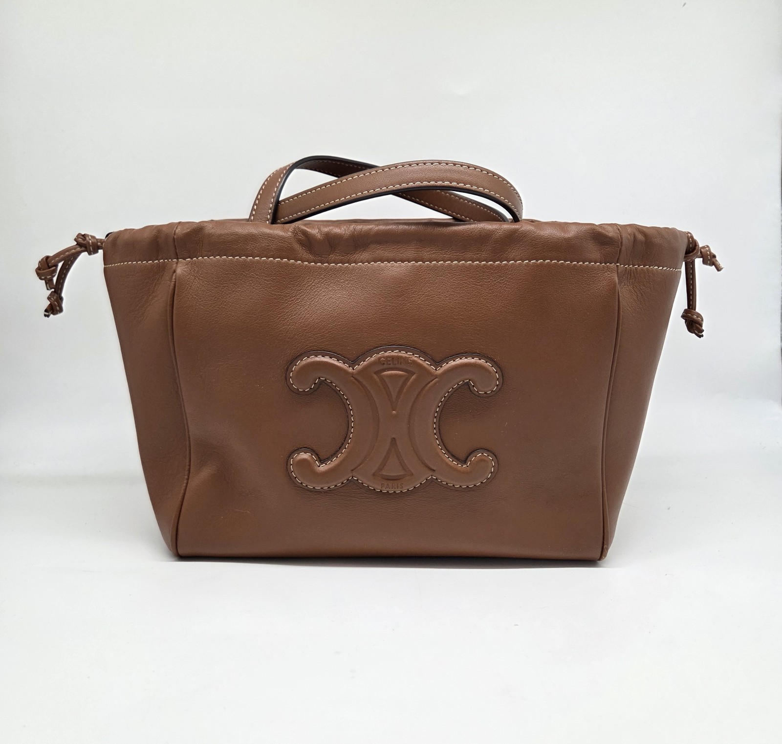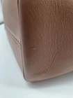 The Celine Small Hippo Drawstring Triomphe Brown Leather Bag is a stylish tote bag designed for women. Featuring a magnetic and drawstring closure, this small-sized bag is made of brown leather with gold hardware accents. The interior is lined with brown suede, and the bag is part of the CELINE Cabas product line. With a unique CELINE Triomphe pattern and a signature Hippo design, this bag combines fashion and functionality for a chic accessory to complement any outfit. There is one tiny imperfection on the bottom. It is a slight nick about 1/8th inch. Can barely be seen and can be easily repaired. See photo.