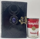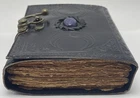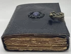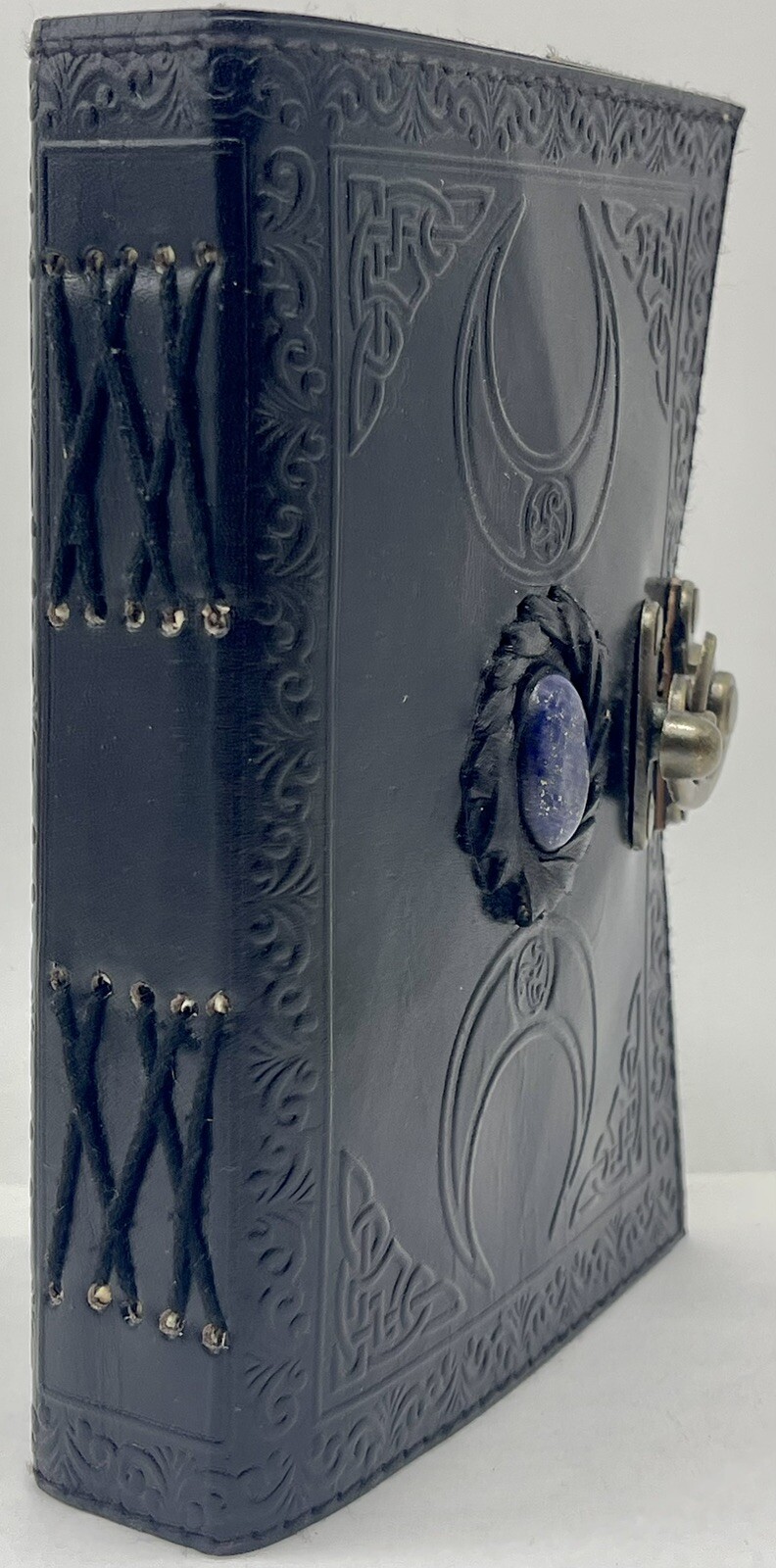 Measures approximately 5 1/8 by 7 1/8 by 1 3/4 inches. Great looking leather bound journal filled with a natural / rustic / parchment type of paper. Black leather cover has a Celtic / mythical stamped motif and is adorned with a blue stone. Contains approximately 100 pages. Journal is unused. No maker's marks evident. Light surface wear as seen in pictures. Thanks for looking and happy buying! Follow this link to see all our listings!