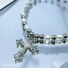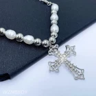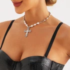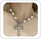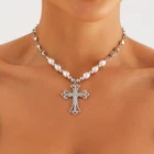 Celtic Rhinestone Cross Necklace Silver Vintage Y2k Pearl Cross Long Pendant Necklace Beaded Bling Choker Necklace Jewelry for Women and Girls|Celtic Rhinestone Cross Necklace Vintage Silver Y2k pearl