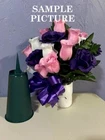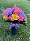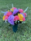 Purchase a lasting tribute for your loved ones with our exquisite Cemetery Vase Memorial Silk Flower Arrangement. Handcrafted with care, each arrangement is a symbol of love and remembrance, designed to bring comfort and beauty to any gravesite. Product Specifications - Comes as pictured with a flat-bottom green plastic vase, and bow - Vase Height: 6" + 3" clip-on stem - Vase Diameter: Top ~ 4", Bottom ~ 2.4" - Bouquet Base: made from industrial grade polystyrene Versatile Placement Adaptable to various memorial settings, our arrangements can be easily removed from the ground vase, allowing them to fit into (4" top) vases attached to a gravesite marker. If the top of the vase is less than 4", you can either trim polystyrene or push the arrangement as far down as the vase allows. Website www.rosyarc.com