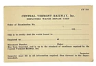 Central Vermont Railway Employee's Watch Repair Inspection Card It measures approximately 2 1/2" x 4" In unused condition. New Old Stock. The card is blank. Please see photos. FAQs All items are examined and every attempt is made to describe them completely and accurately. However, most items are antique/vintage, and by virtue of their age will not be perfect. They are previously owned and may show very fine handling marks and shelf wear and will not be perfect. Upon receipt if you have any concerns please contact me! If for any reason you are inclined to rate your experience less than five stars contact me first - lets discuss. Customer support is important to me as is your satisfaction! Combined Shipping? Yes, we do, and you will save $$ when you buy more than 1 item from us. Will my item be insured in transit? Yes, automatically by Ship Saver, the Post Office or Self Insurance. How will it be packed? Professionally! In bubble wrap with plenty of clean, recycled products and packaging tape for security. How can I pay? PayPal or other- Contact us if you need other payment method. Sorry, but after 7 days' of non-payment, eBay gets involved. Any issue, please talk to us! THANK YOU for shopping with P-B-Antiques