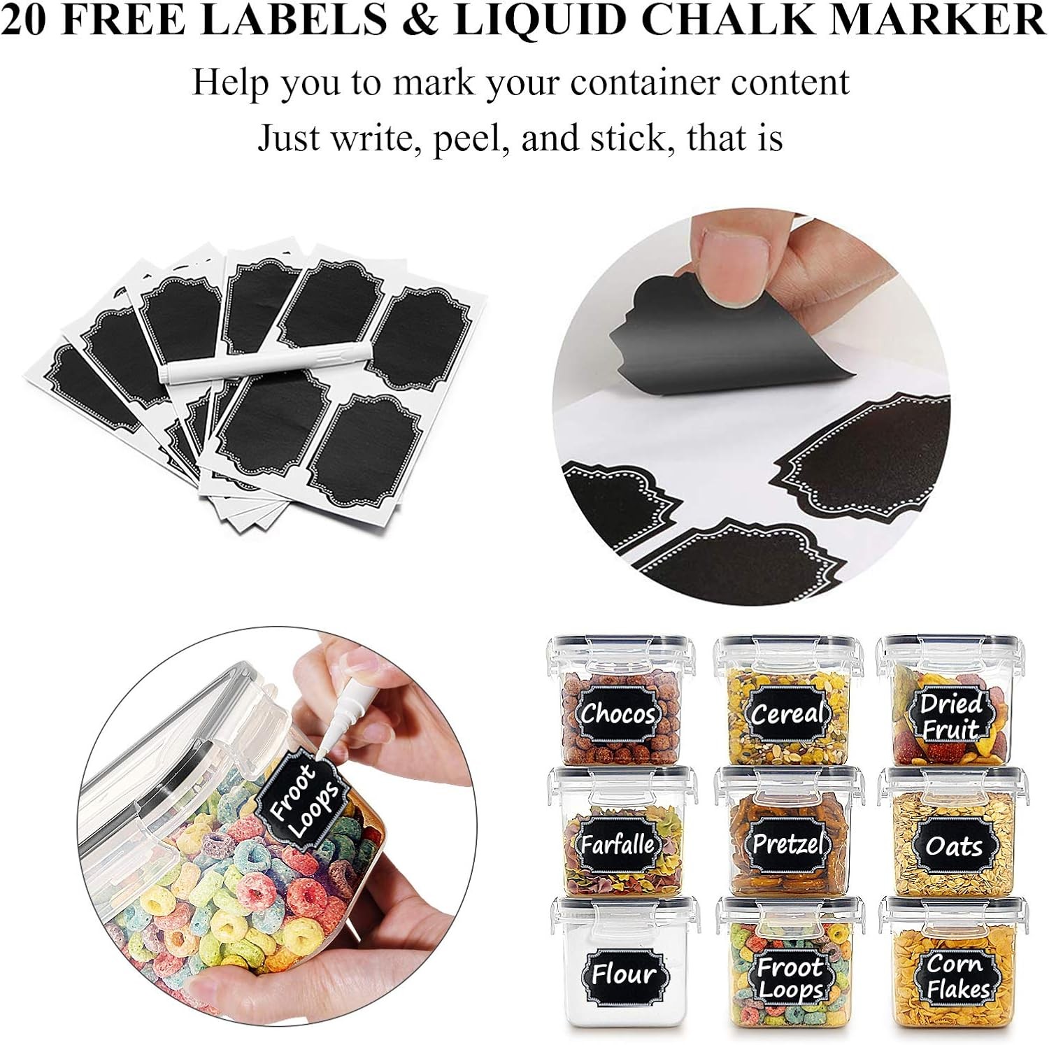 About this item SET INCLUDES: This set Includes 16 small airtight containers [0.8L /3.38 Cups], which are perfect for storing a small box of cereal, 20 chalkboard labels and 1 marker pen, allowing you to organize your kitchen and pantry like never before SECURE SEALING: Each storage container features an air-tight 4 sided-locking system resulting in a watertight and airtight seal, keeping your cereal super fresh HIGH QUALITY: Made of high-quality food grade plastic, BPA free, contain no harmful substances. The durable plastic containers can be used for a long time, good for you and safe for your family MULTIPURPOSE: These containers are suitable for storing flour, sugar, rice, nuts, beans, cereal, snacks, pet food, or anything else you may need to store. These plastic storage containers can be used as bakeware containers or be refrigerated. Microwave(Less then 212F), freezer & dishwasher safe SEE THROUGH & STACKABLE: The clear storage containers body are durable enough for long-lasting use, you can quickly see what inside just at a glance. These containers also have a stackable and modular design, will save you a ton of space in your pantry fridge, freezer or cabinets for better kitchen organization Brand: Color: Black Material: Plastic Material Feature: BPA Free Capacity: 0.8 Liters