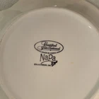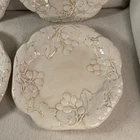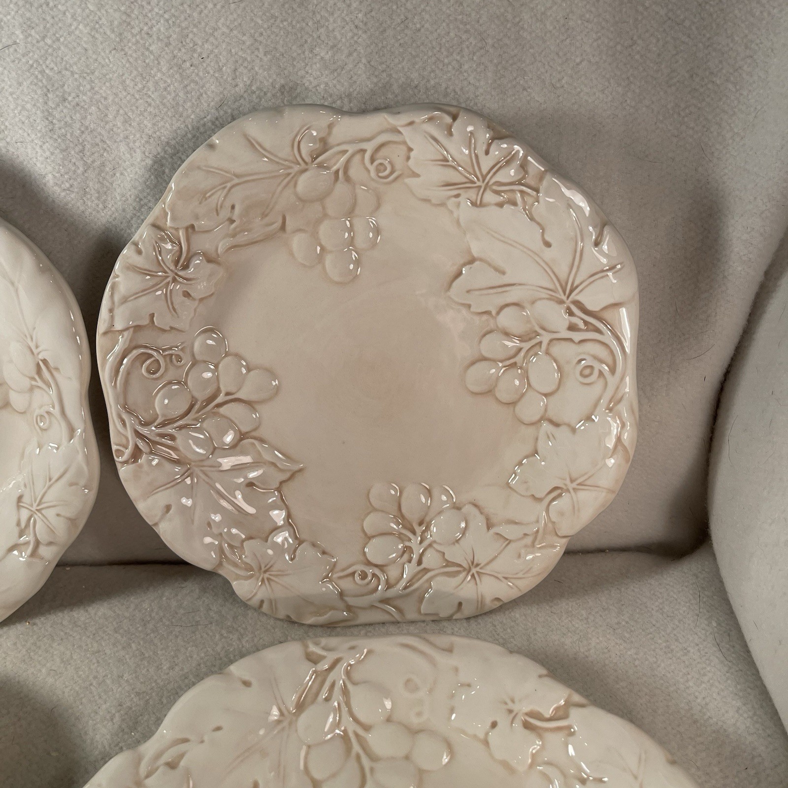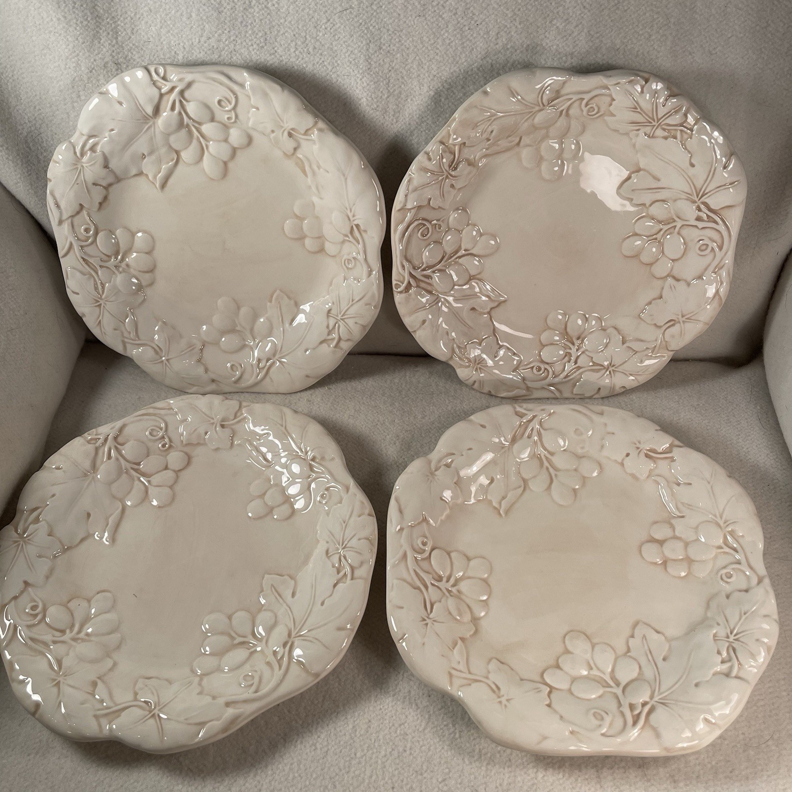 The Certified International Napa Salad Plates set of 4 features a white ceramic construction with an embossed grapes and leaves pattern, making them a stylish addition to any table setting. These dishwasher-safe plates are perfect for all occasions and showcase a contemporary design with a glossy finish. The plates are 8 3/8" in diameter and come from the Nappa product line, known for its quality and style in the world of pottery and glass. Whether for serving salads, appetizers, or desserts, these plates are both functional and decorative, adding a touch of elegance to your dining experience. Excellent condition. No chips or cracks.