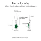 If she is an old-school aesthetic then this Lab Created Emerald Pendant Necklace is a stunning choice for her. Exuding elegance and sophistication this stunning Green Emerald Bridal Necklace has rich hue of 5X7 mm Pear Shaped Lab Created Emerald in Prong Prong Setting with brilliant cut Moissanite on the teardrop frame that beautifully dangles through an 18 inch Chain. Exquisitely crafted in Gold Plated Silver this Pear Shaped Emerald Necklace adds a touch of glamour to the outfit, capturing the light that draws attention of the onlookers. As a symbol of love and commitment this Lab Emerald May Birthstone Necklace is sure to be cherished for years to come. Having a captivating allure and symbolic meaning this Teardrop Pendant Necklace has Aaaa Quality and D-Vs1 Quality of Moissanite. Emerald lovers will adore this must-have beauty. This Pendant Necklace showcases a Pear Shape Lab Grown Emerald in prong set while petite Round Moissanite sparkles on the unique motif. This striking contrast of the gems adds a delightful charm. Experience the epitome of elegance and sophistication with our lab-grown emeralds. A flawless addition to your jewelry collection, they accentuate your unique style and illuminate your inner radiance. Our lab grown emeralds boast a mesmerizing green hue, elevating the allure of your jewelry pieces to new heights. Quality Assurance- 925 Sterling Silver; Lab Grown Emerald Quality: AAAA ; Total Lab Grown Emerald Carat : 0.70 (Approx.); Moissanite Quality: D-vs1 ; Total Moissanite Carat : 0.18 (Approx.) Safe and Secure Packaging - All of our jewelry items arrive in high-end signature jewelry pouch, ensuring they are ready for proposals/gifting purpose so that you don't have to spend any time in packing them. Shop with Confidence - assures you to get people's heads turned with our sparkling jewelry pieces which are authentically certified just for your peace of mind. sku:-RCPE012510064
