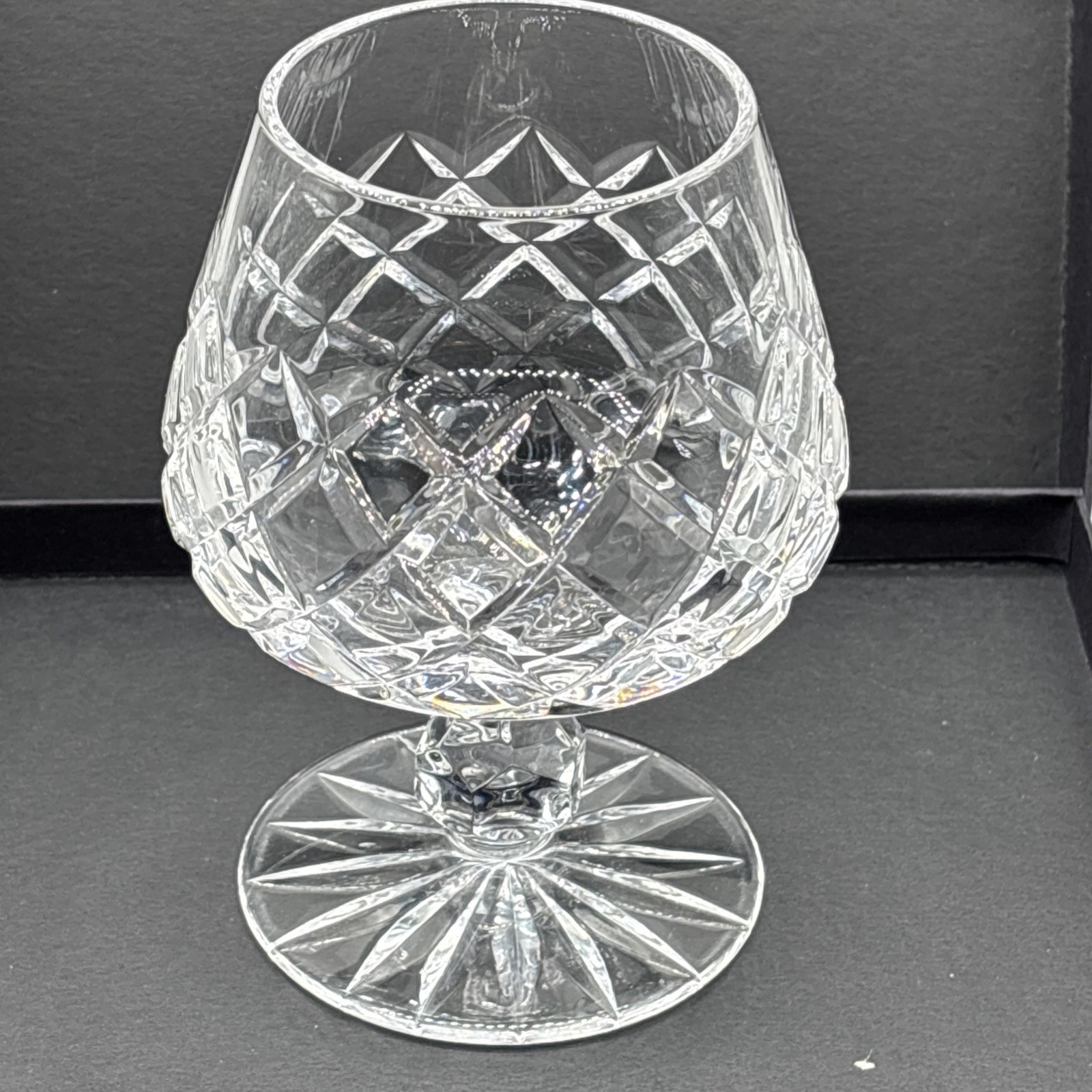 This is a Ceska Crystal Canterbury pattern brandy goblet, featuring a distinctive diamond cut pattern on the bowl and a starburst design on the base. Manufacturer: Ceska. Pattern: Canterbury. Item: Brandy Goblet / Snifter. Material: Lead Crystal. Dimensions: Approximately 4 3/4 inches in height. Fast shipping and carefully packed for safe arrival.