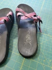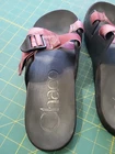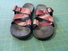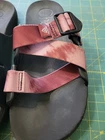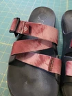 These are Chaco Women's Size 10 Chillos Slip On Slides in Red Mahogany Tie Dye. They feature a flat heel, cushioned and comfortable design with adjustable straps. These casual slide sandals are perfect for all seasons and have a breathable Polyester upper with a rubber outsole. Ideal for women looking for a stylish and comfortable sandal option.