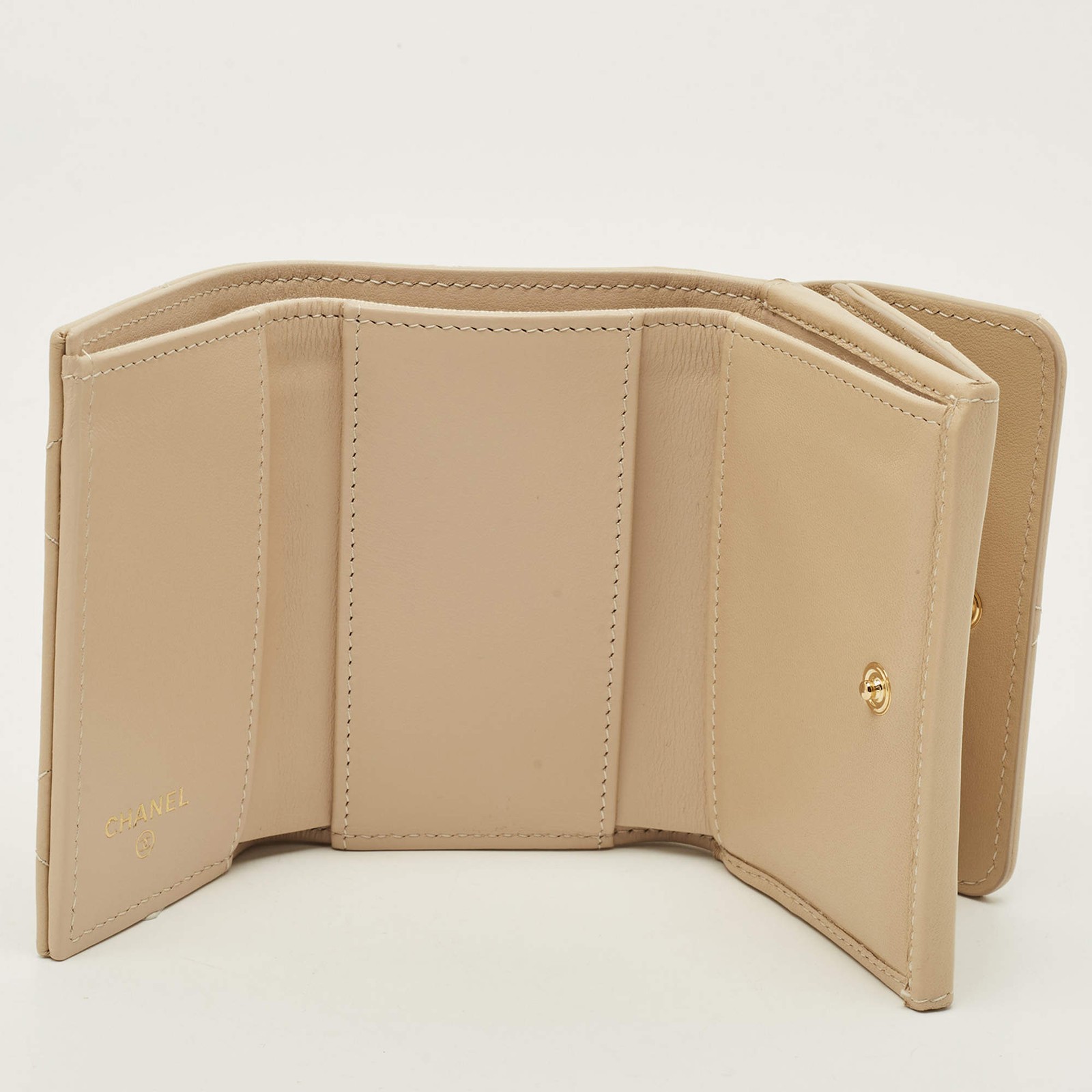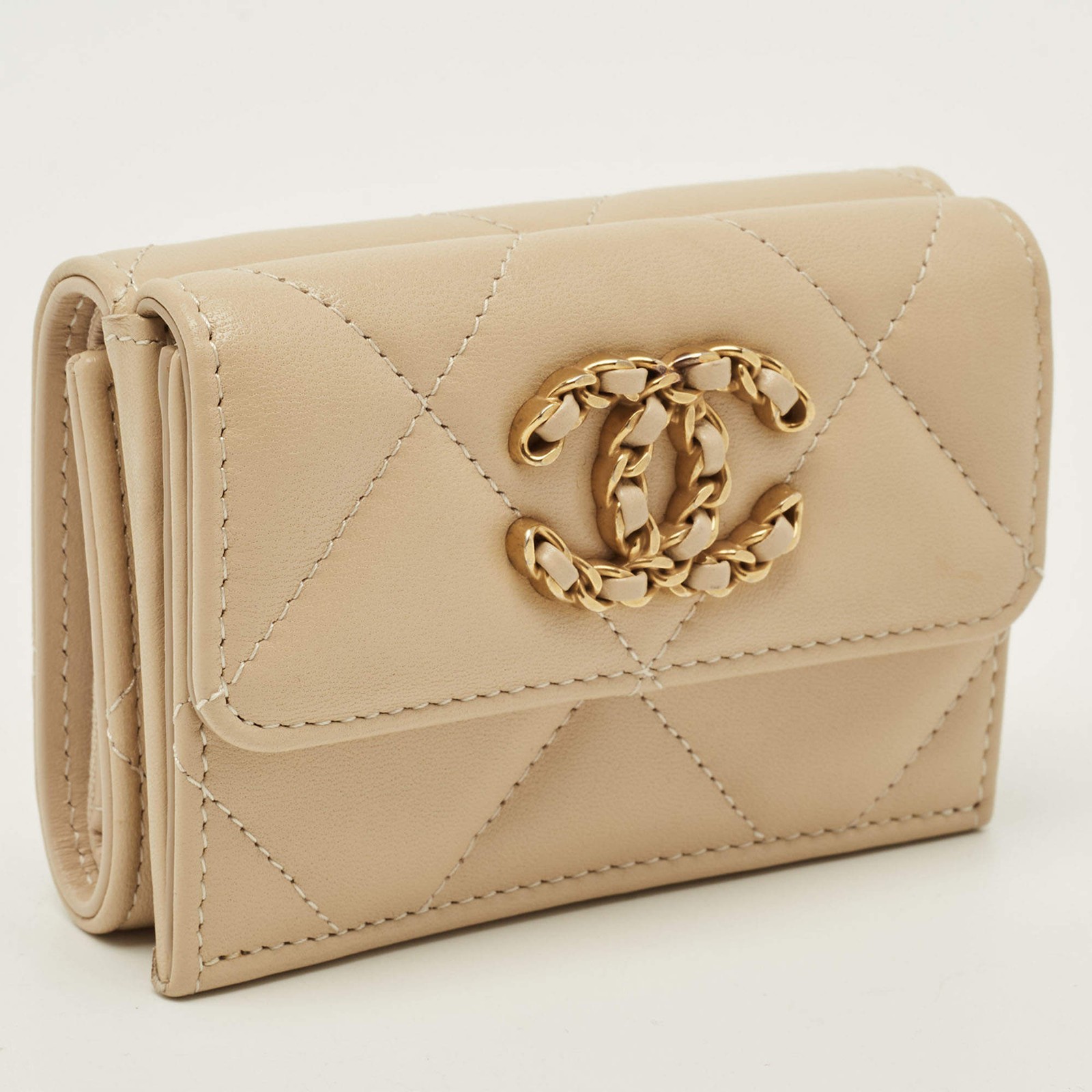 Our eBay Store About Us Contact Us Add to Favorite Sellers Chanel 19 Beige Quilted Leather Trifold Wallet Designed for daily rhythm, this Chanel 19 trifold wallet is crafted from beige quilted leather with a compact, easy to use interior. It slips effortlessly into smaller bags, holding essentials without interruption. A piece that feels familiar from the first use, carrying texture, balance, and quiet confidence. Product Details Brand Chanel Color Beige Includes The Luxury Closet Packaging, Authenticity Card Material Leather and Fabric Certified by The Luxury Closet This item has gone through a detailed authentication process overseen by our experts. We offer a lifetime guarantee of authenticity on all our items. How We Check The in-house team of experts at The Luxury Closet is highly trained to verify the authenticity and the condition of the luxury products. They ensure that only 100% authentic items are put on sale.The evaluation process is unique with its own mix of assessment criteria and differs according to the category. Each item is evaluated based on the following combination of hallmarks, hardware, stitching, symmetry, material, craftsmanship, stamping, codes, hologram stickers, and packaging. Our authenticators also check if the items have been modified or amended (e.g., aftermarket diamonds, replaced batteries, repaired bags, etc.) International Buyers Import duties, taxes and charges are not included in the item price. These charges are the buyers responsibility. Please check with your country’s customs office to determine what these additional cost will be prior to buying.