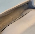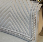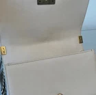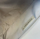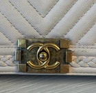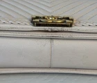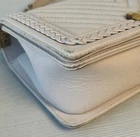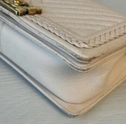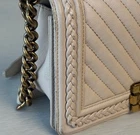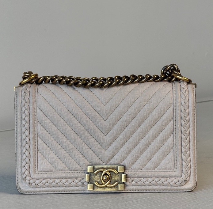 The Chanel Boy Medium Caviar Chevron Braided Leather Flap Shoulder Bag is a sophisticated and stylish accessory designed for women. Featuring a rectangular shape with a push lock closure, this medium-sized bag is perfect for both casual and formal occasions. The exterior is crafted from leather with a chic light beige color, complemented by gold hardware and a shoulder strap handle style. The interior is lined with leather in a matching beige color, adding a touch of luxury to the overall design. This designer bag from Chanel's Caviar collection exudes elegance and timeless charm. Exterior condition: moderate wear, scuffs/ peeling at corners and braids. Scratches and discoloration at hardware( buckle and strap). Shape relaxed. Creasing on the sides. Inside: moderate wear, uncleanliness and markings. Scuffs at lining.scratches and discoloration at hardware. The bag needs spa