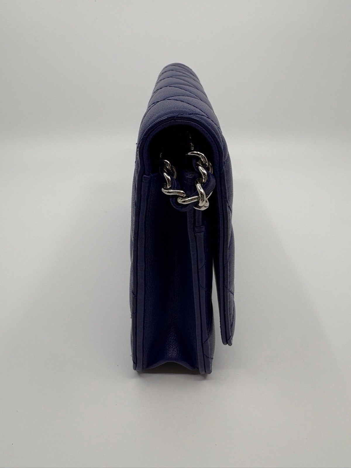 The Chanel Classic Wallet On Chain in Navy Blue is a stylish and luxurious handbag designed for women. Made from high-quality lambskin leather, this bag features the iconic Chanel Classic model and style. The WOC design makes it convenient to carry around while maintaining a chic and sophisticated look. With its timeless elegance and prestigious brand, this Chanel handbag is a must-have addition to any woman's accessory collection.