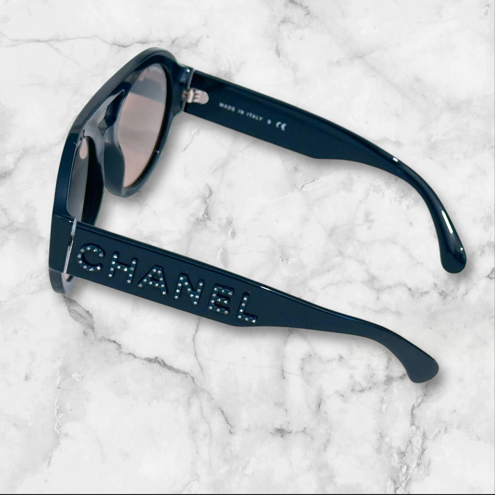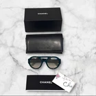 Chanel Aviator Sunglasses - Limited Edition Approx measurements: Front length: 5.5” Front height: 2.25” Lens: 2 x 1.75” Arm length: 5” Aviator style sunglasses in green acetate Gradient green polarized lens CC logo with Strauss Crystals on one side Chanel with Strauss Crystals on other side Chanel on both lenses Comes with original box, case, & limited edition lens cloth with Lagerfeld sketch Made in Italy Retail $790