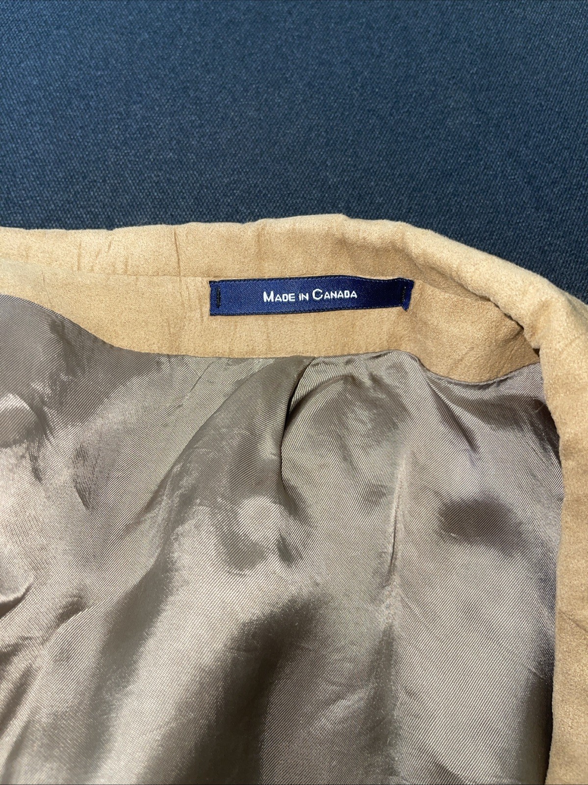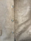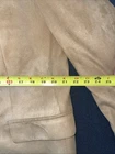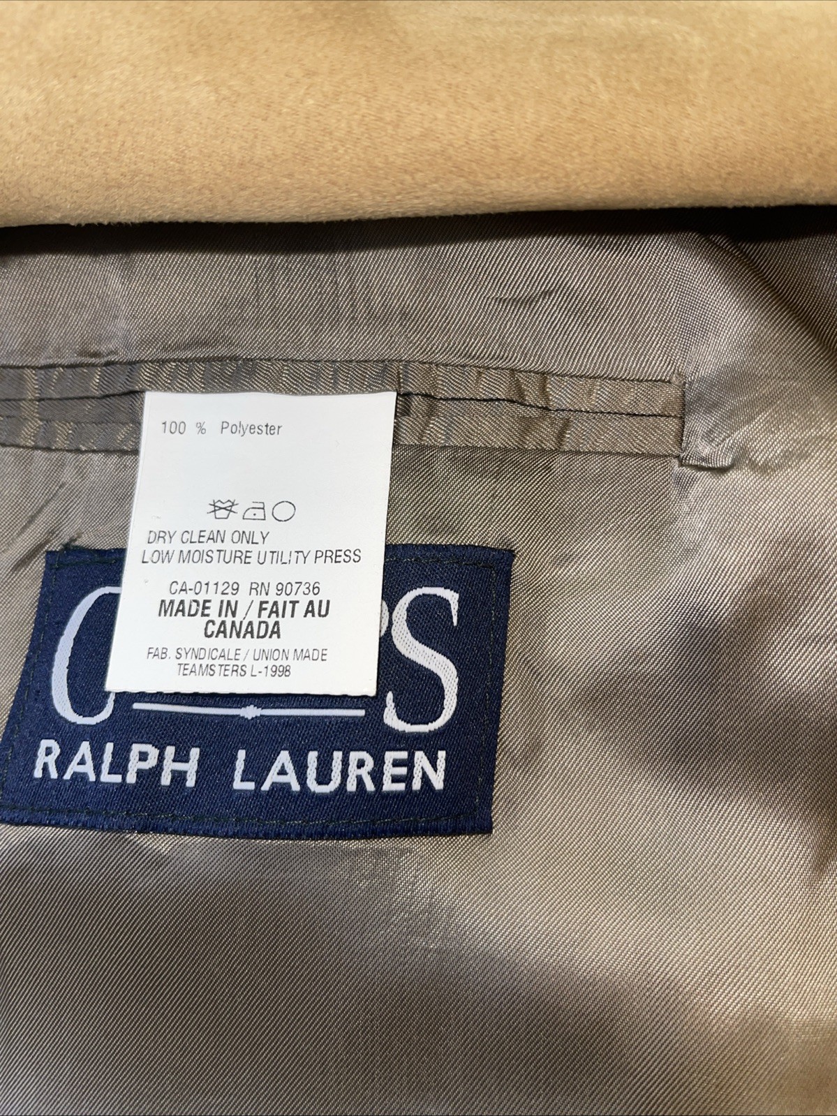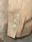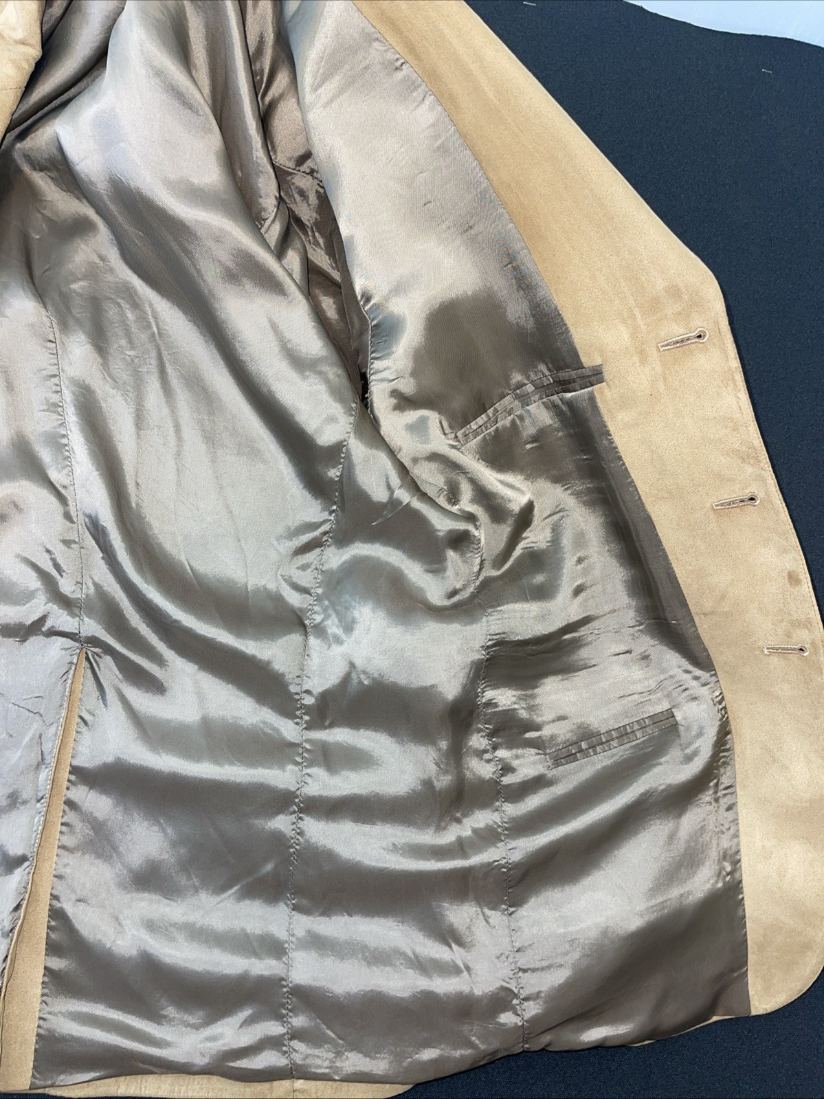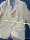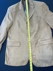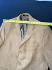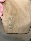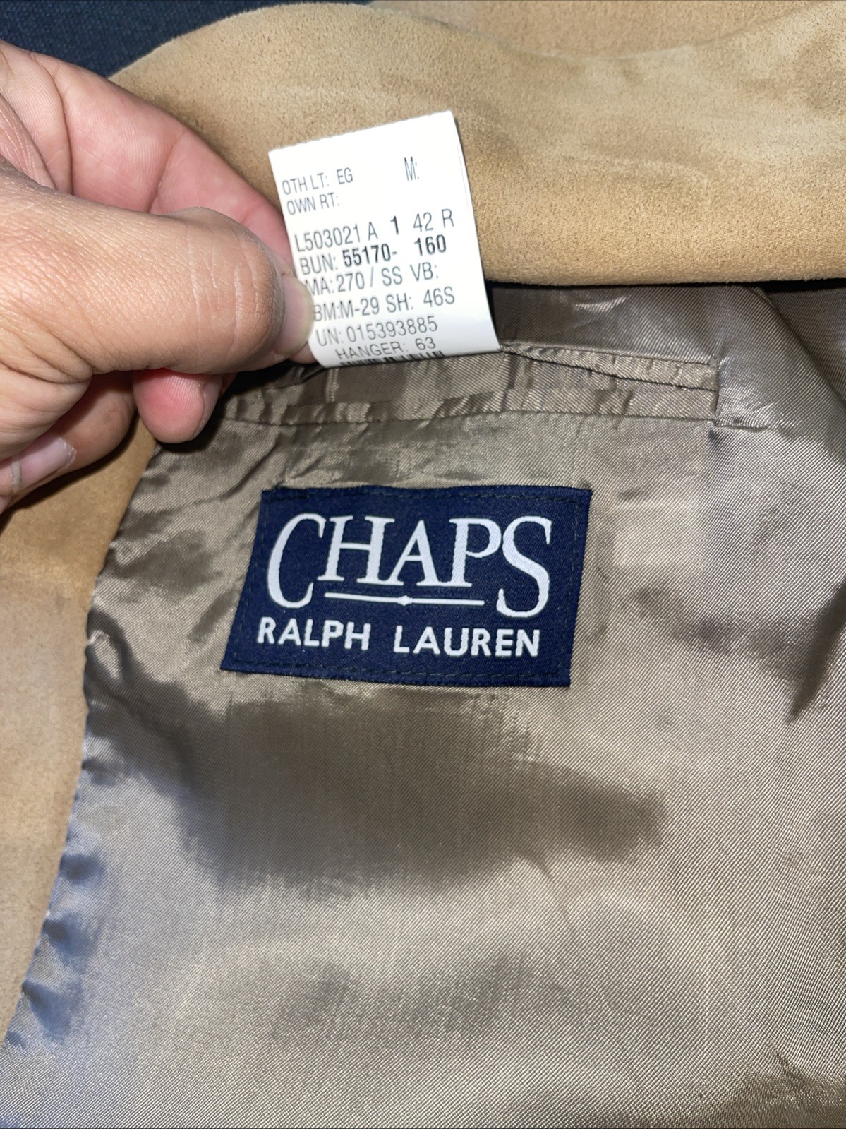 Almost like New This Chaps Ralph Lauren Men's Tan Suede Blazer Jacket in size 46S is a classic and versatile piece perfect for casual or business occasions. Made with quality materials like suede and polyester, this blazer features a notch lapel, four-button sleeve button style, and a three-button front closure. The jacket also includes inner pockets and is designed for a regular fit with a single-breasted cut. Whether it's fall or spring, this stylish blazer in a solid brown color is a timeless addition to any wardrobe, suitable for dry clean only to maintain its appearance.