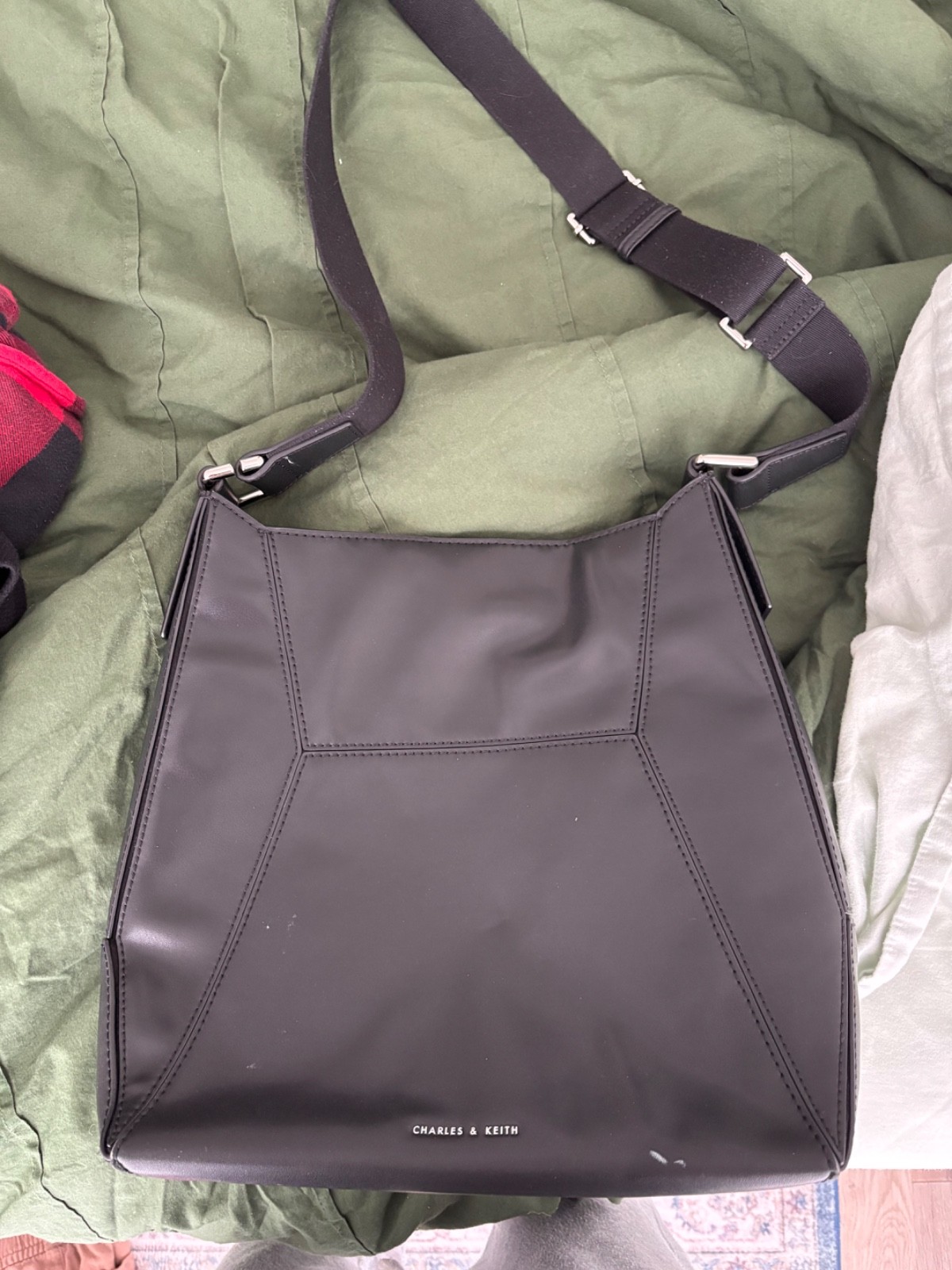 The Charles & Keith Nasrin Geometric Tote Bag in Noir is a stylish and spacious handbag designed for women. Made from faux leather with a geometric pattern, this tote is perfect for carrying your everyday essentials in a chic and trendy way. The classic black exterior makes it versatile enough to pair with a variety of outfits, while the durable material ensures long-lasting use. Perfect for adding a touch of sophistication to any outfit, this tote from Charles & Keith is a must-have accessory for any fashion-forward woman.