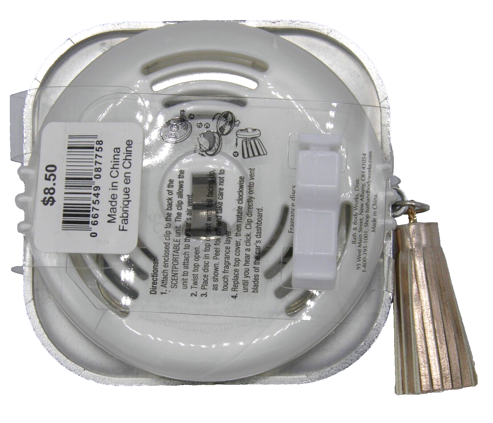 UPC:0667549087758Item Diameter:3 inFeatures:Odor EliminatorColor:Silvergtin13:0667549087758Number of Settings:1Item Weight:0.6 ozMaterial:PlasticType:Car Vent ClipNumber in Pack:1Installation Area:VentStyle:ContemporarySuitable For:CarGTIN:0667549087758Brand:Bath & Body WorksItem Height:3 in