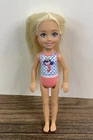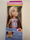 Barbie Chelsea 6” doll. Beach/water themed. Mattel. Plastic doll with straight blonde hair and blue eyes. This doll is part of the Chelsea character line and is suitable for children aged 3 and above. The set includes one doll in its original packaging, making it a perfect addition to any doll collection or for imaginative play.