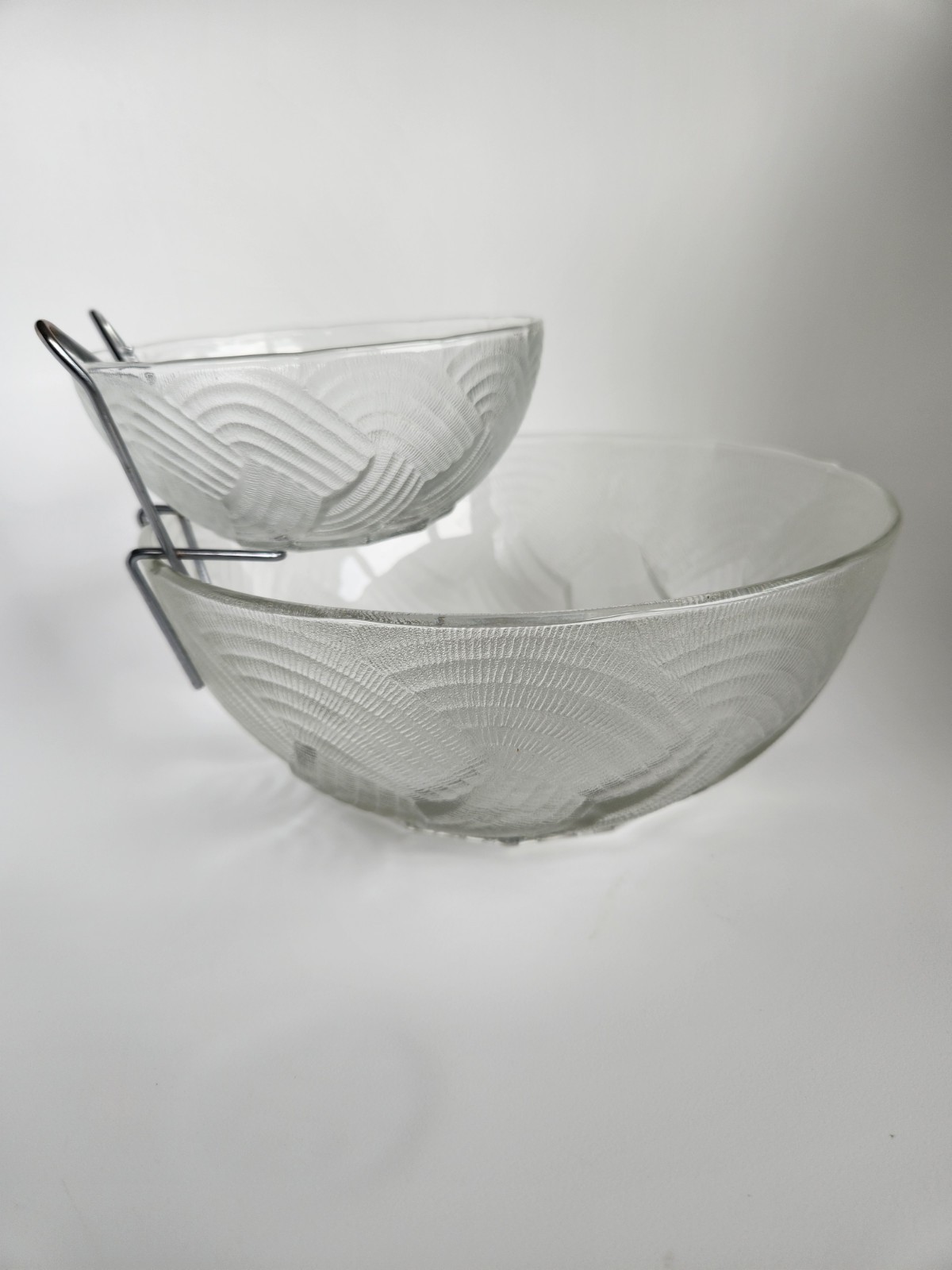 Pre-owned item. No cracks or damage. Item will be packaged safely to ensure maximum protection when being delivered. Return Policy This is a pre-owned item with all details reviewed and documented. Returns are not accepted due to the item's "pre-owned" condition. If a return is still requested, the buyer must cover return shipping costs. Elevate your next gathering with the vintage Pasari glass chip & dip bowl set, a testament to the eclectic design of the 1990s. Crafted in Indonesia, this set features a round holder, dip bowl, and a clear glass bowl with an intricate wicker pattern that exudes a timeless charm. The fusion of art glass techniques adds a touch of elegance to this functional piece, making it a delightful addition to any decor. Each piece in the set is handmade, ensuring uniqueness and character. The set's theme is Chip-N-Dip, perfectly captured in the production style and technique used. Whether you're hosting a casual get-together or an upscale event, this Pasari glass bowl set will be a conversation starter and a delightful centerpiece for your table.