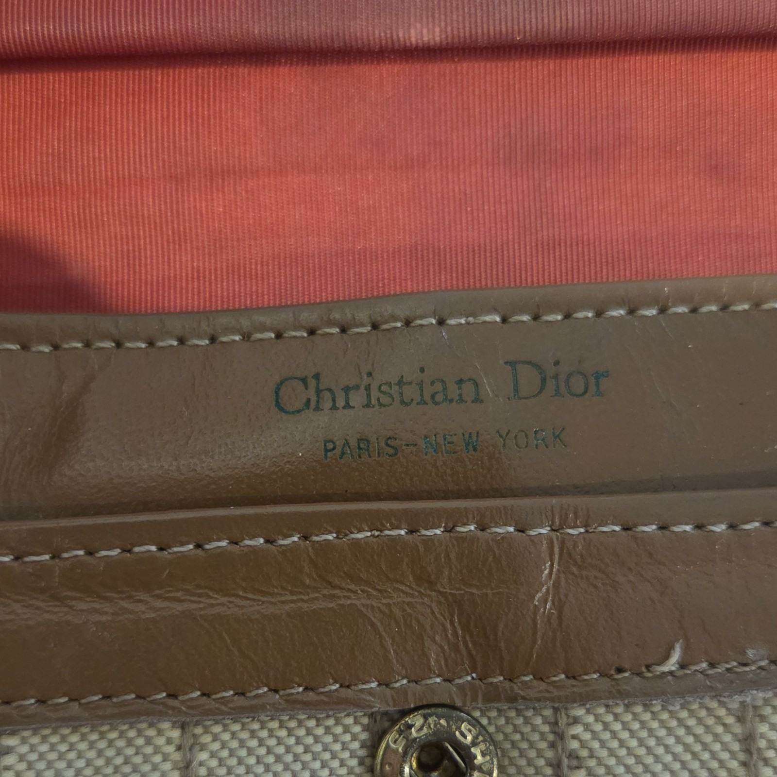 The Christian Dior Brown Beige Women's Wallet is a stylish and sleek accessory for women. Made from a combination of canvas and leather materials, this wallet features a geometric pattern with a button and logo accents. Measuring 8.5 inches in length and 4.5 inches in width, this folding wallet is perfect for carrying your credit cards and cash. The brown and beige color combination adds a touch of elegance to your outfit, making it a versatile and practical accessory for any woman's wardrobe.