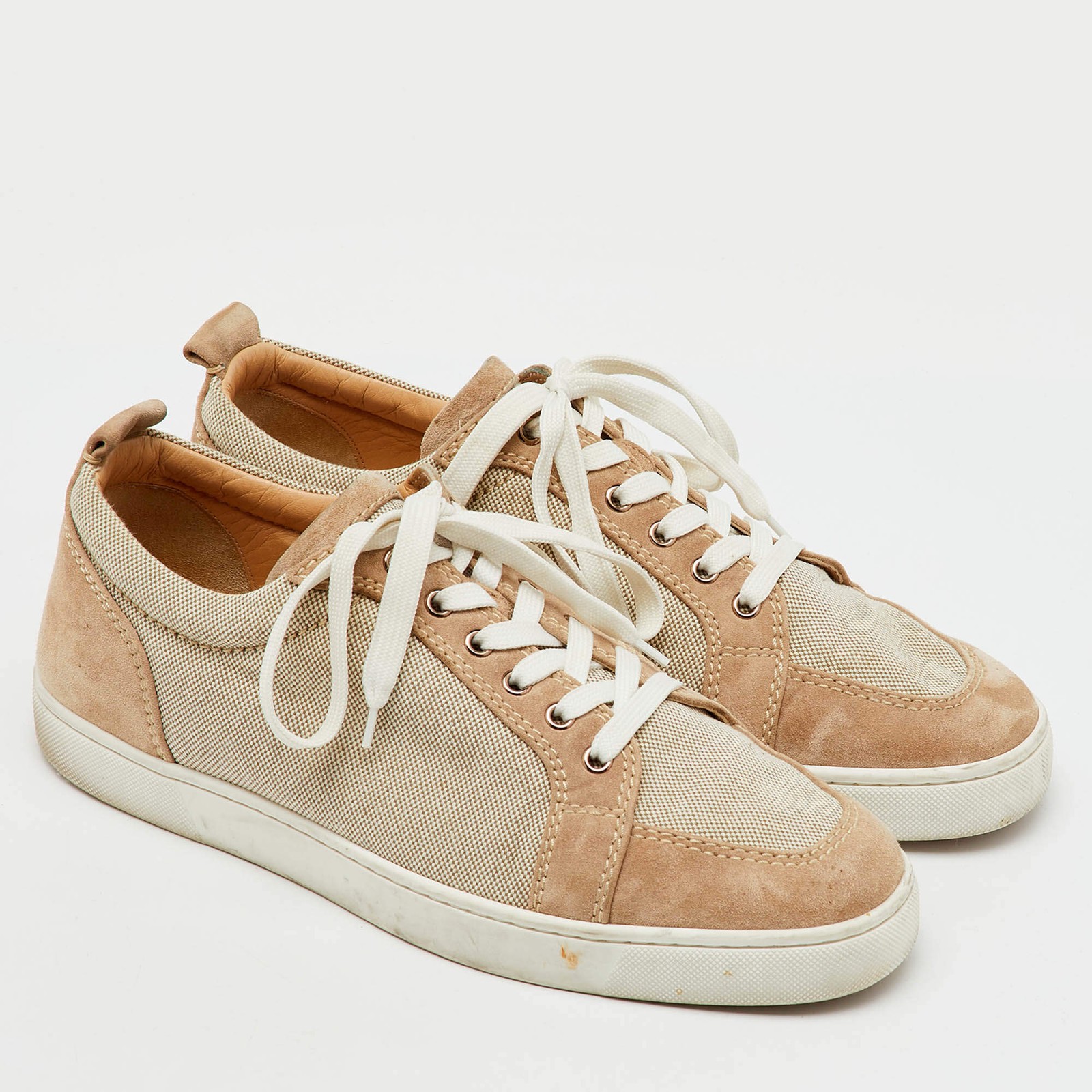 Our eBay Store About Us Contact Us Add to Favorite Sellers Christian Louboutin BeigeWhite Canvas and Suede Rantulow Low Top Sneakers Size Louboutin gives casual dressing a sharp twist with these Rantulow sneakers. Canvas and suede panels in beige and white set the tone for easygoing looks — finished, of course, with that signature red sole underneath. Product Details Brand Christian Louboutin Color Beige Includes Original Dustbag Outsole Length 31 cm Outsole Width 10.5 cm Size 44.5 Certified by The Luxury Closet This item has gone through a detailed authentication process overseen by our experts. We offer a lifetime guarantee of authenticity on all our items. How We Check The in-house team of experts at The Luxury Closet is highly trained to verify the authenticity and the condition of the luxury products. They ensure that only 100% authentic items are put on sale.The evaluation process is unique with its own mix of assessment criteria and differs according to the category. Each item is evaluated based on the following combination of hallmarks, hardware, stitching, symmetry, material, craftsmanship, stamping, codes, hologram stickers, and packaging. Our authenticators also check if the items have been modified or amended (e.g., aftermarket diamonds, replaced batteries, repaired bags, etc.) International Buyers Import duties, taxes and charges are not included in the item price. These charges are the buyers responsibility. Please check with your country’s customs office to determine what these additional cost will be prior to buying.