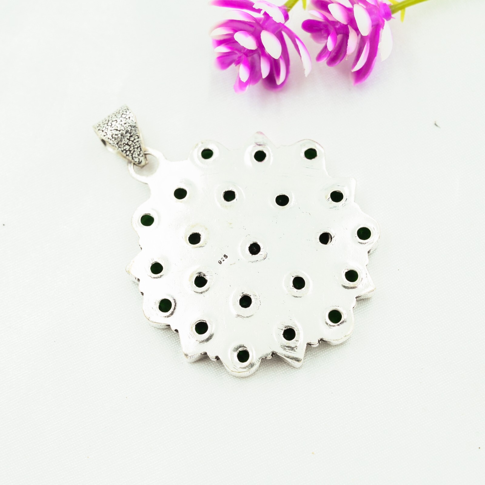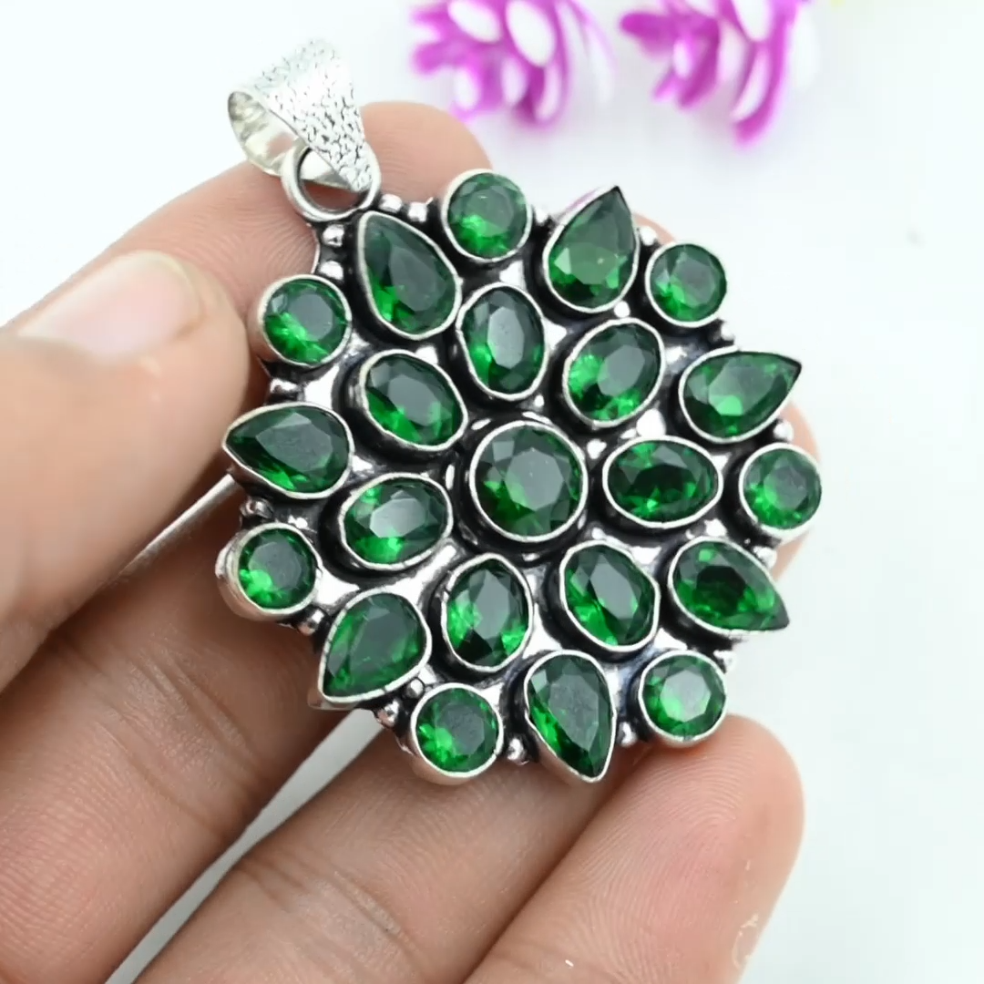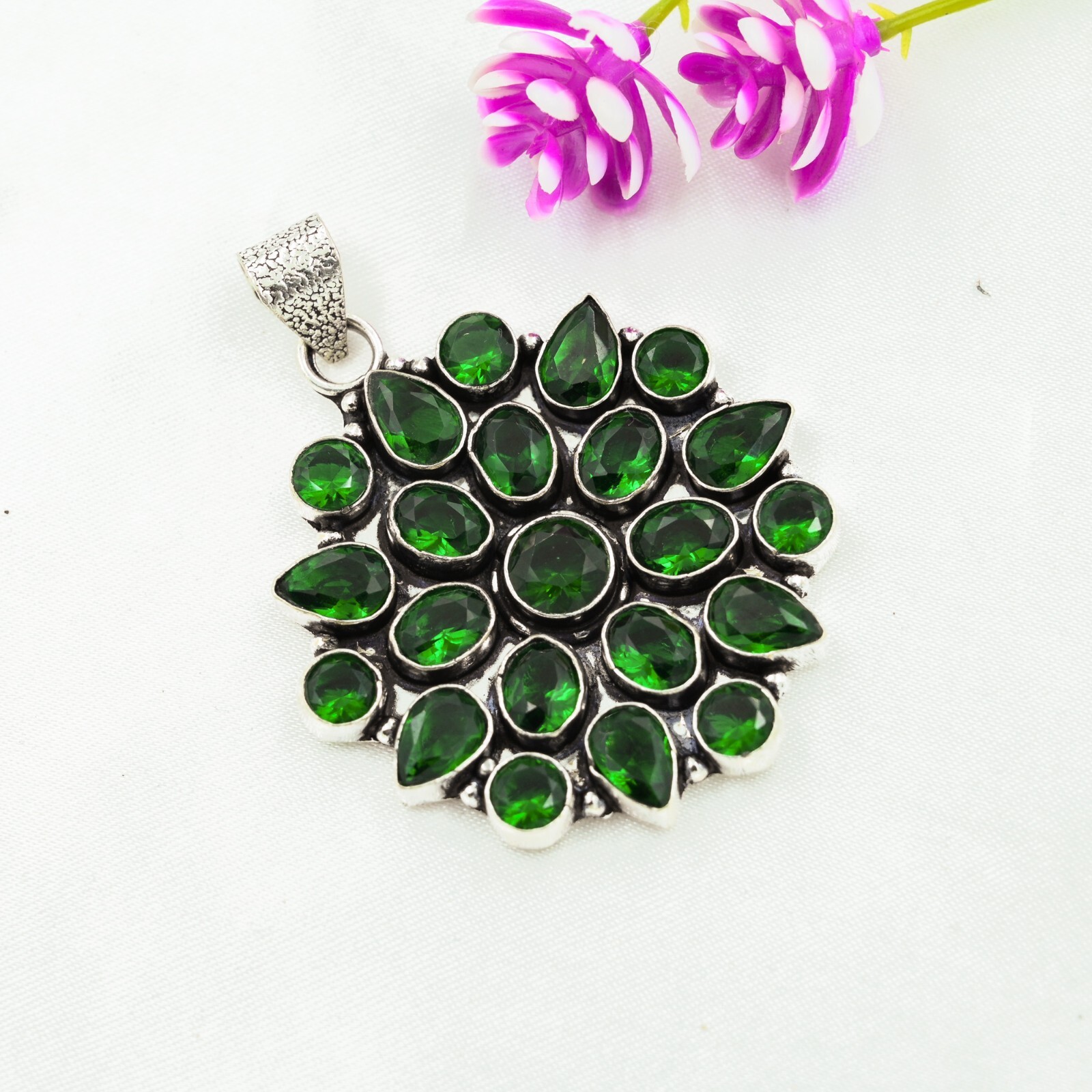 Pendant Shape:Same As PictureNumber of Gemstones:22Number of Diamonds:N/ABrand:HandmadeCertification:N/ACountry of Origin:IndiaBase Metal:Sterling SilverGemstone Clarity Grade:Eye CleanCut Grade:N/APendant/Locket Type:Same As PictureOccasion:Anniversary, Birthday, Christening, Christmas, Engagement, Father's Day, Mother's Day, Valentine's Day, WeddingChain Type:N/AMaterial:GemstoneType:PendantClosure:Same As PictureFeatures:HandmadeMetal:Sterling SilverMain Stone Shape:Same As PictureMain Stone Color:GreenMain Stone:Chrome DiopsideDiamond Clarity Grade:N/ACollection:HandmadeDiamond Color Grade:N/ASecondary Stone:N/ASetting Style:Same As PictureCountry/Region of Manufacture:IndiaStyle:PendantNecklace Length:2.36 cmColored Diamond Intensity:N/AMain Stone Treatment:Not EnhancedColor:SilverMetal Purity:925Main Stone Creation:Lab-CreatedTheme:Beauty, Bohemian, Ethnic, Halloween, Love, NatureTotal Carat Weight:10 carat and above