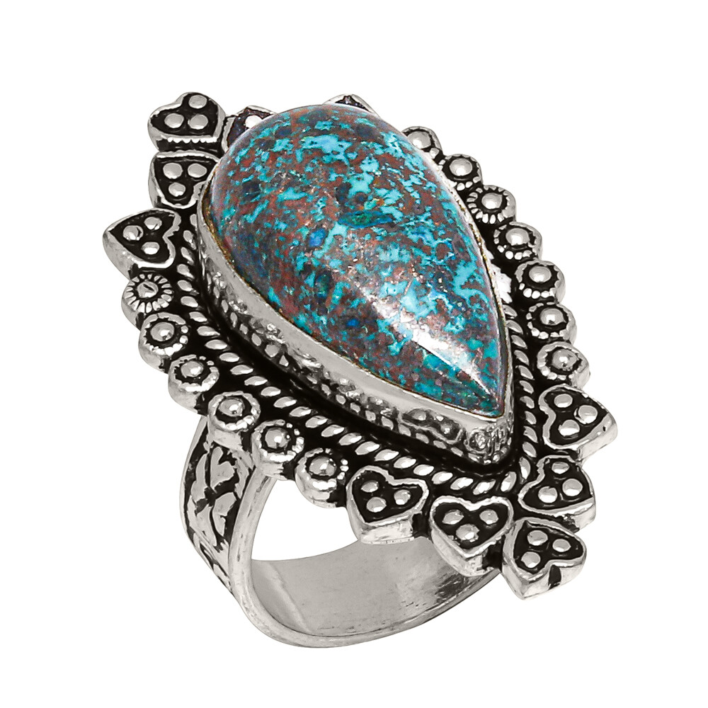 Absolutely stunning craftsmanship! The chrysocolla stone has such vibrant colors and the silver setting feels substantial and well-made. It arrived quickly and looks even better in person - definitely a unique, high-quality piece I'll treasure!
